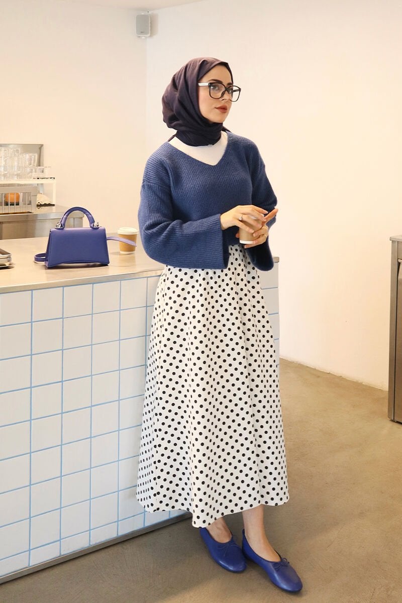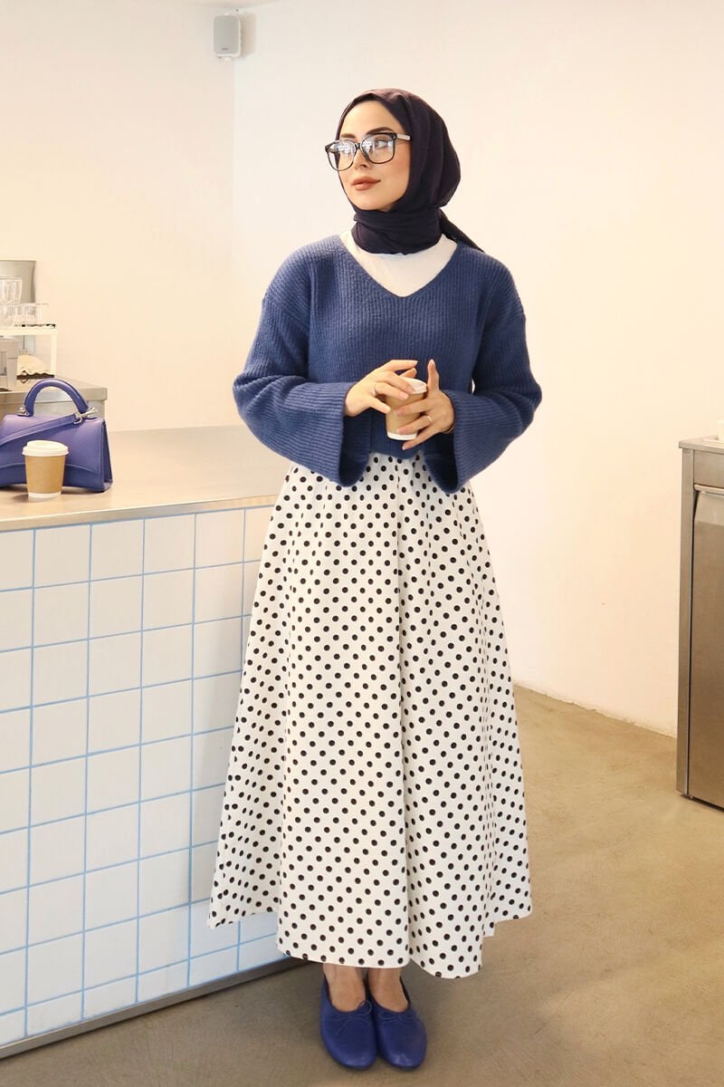 Beyaz Siyah Puantiyeli Keten Kloş Etek