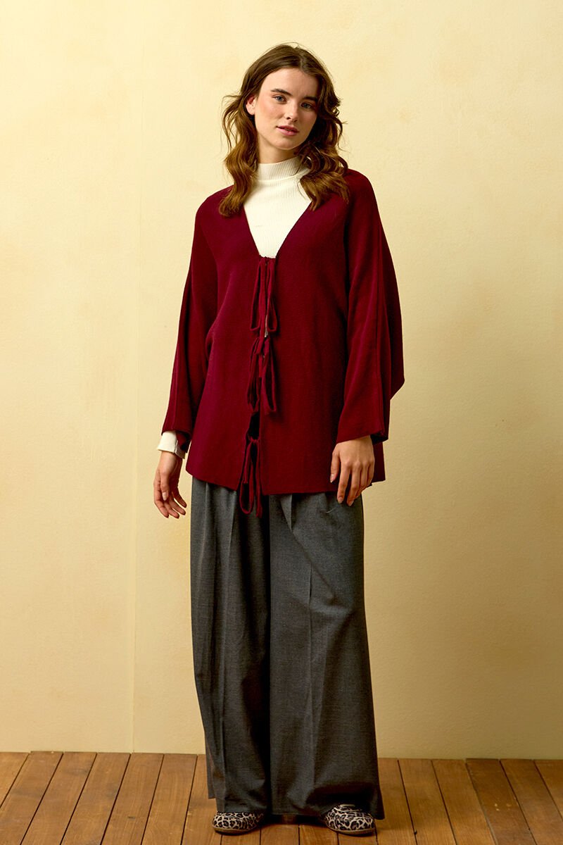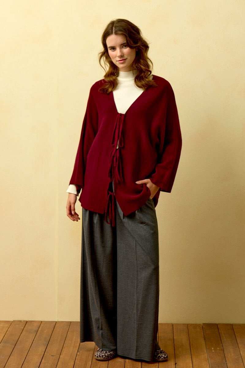 Bordo 3 Fiyonklu Triko Ceket & Antrasit Pile Detay Palazzo Pantolon