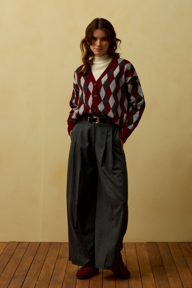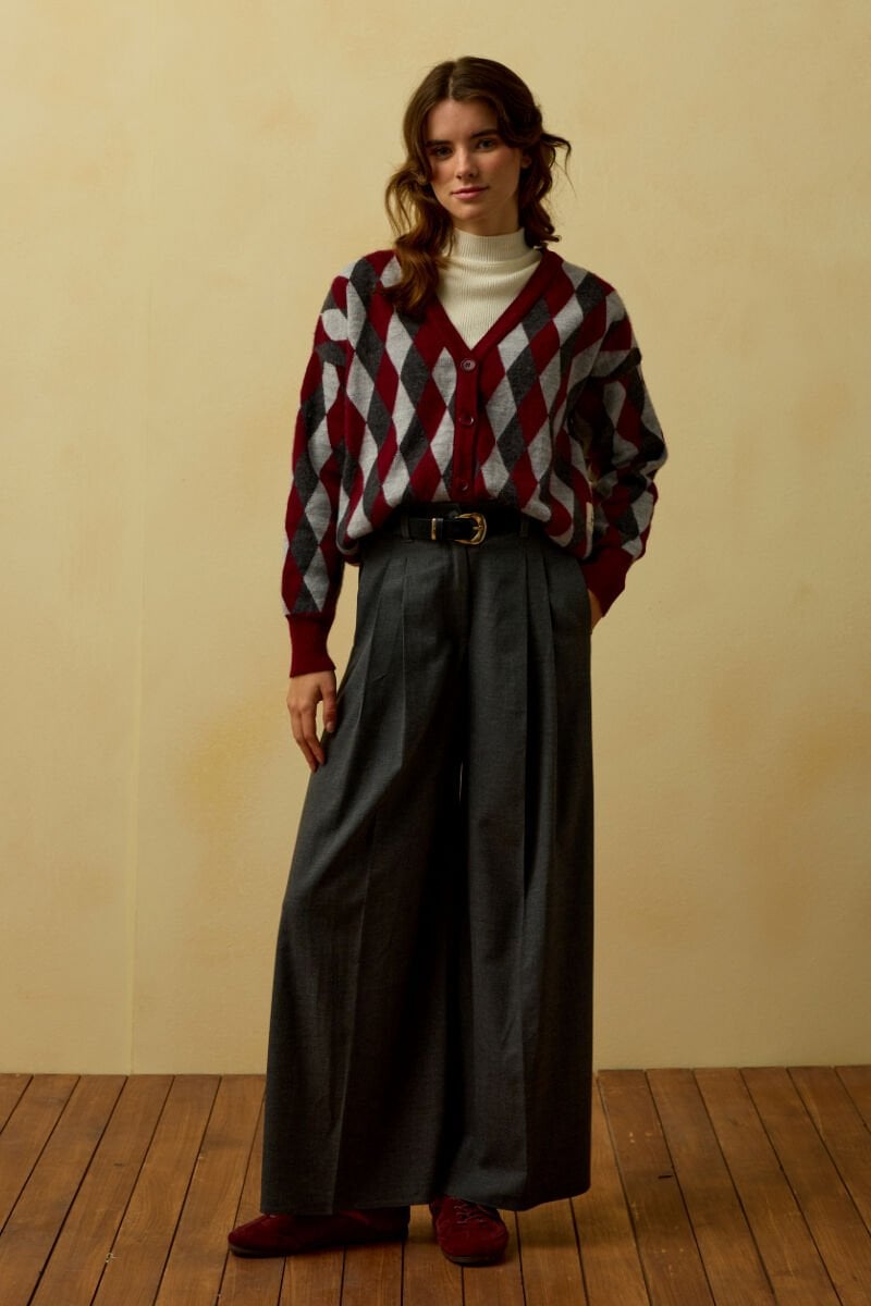 Bordo Baklava Desenli Triko Hırka & Antrasit Pile Detay Palazzo Pantolon