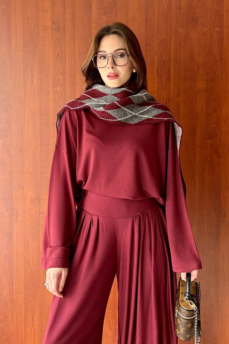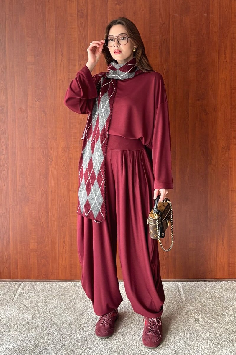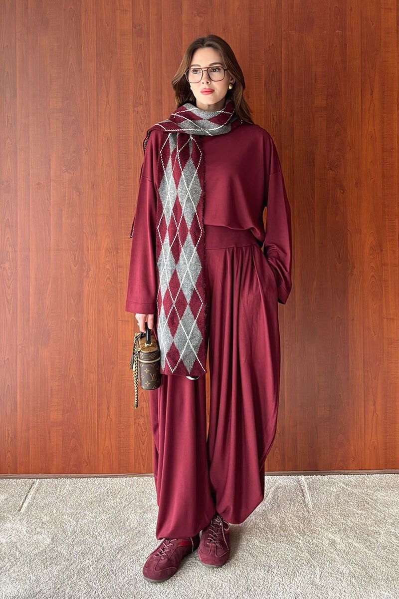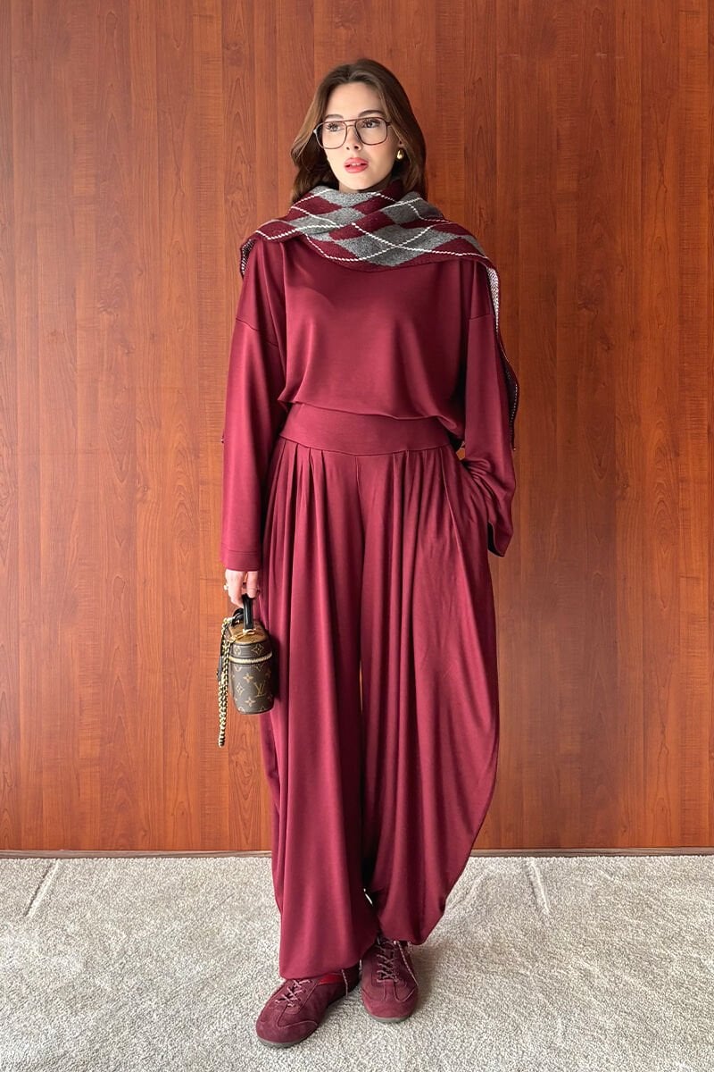 Bordo Oysho Kumaş Pileli Şalvar Takım
