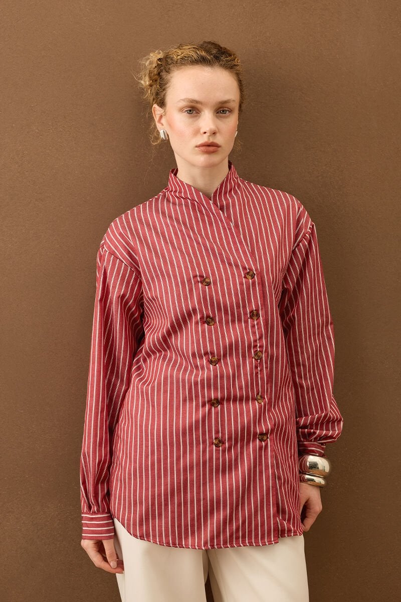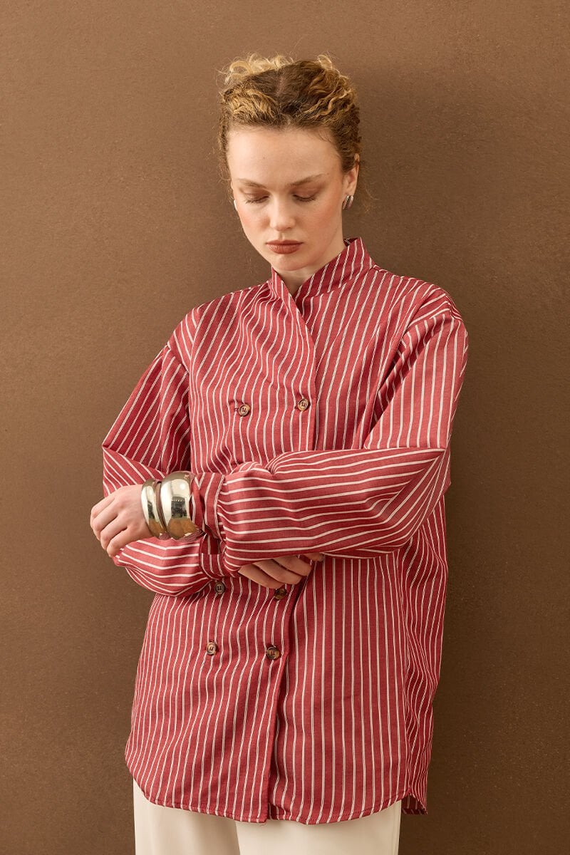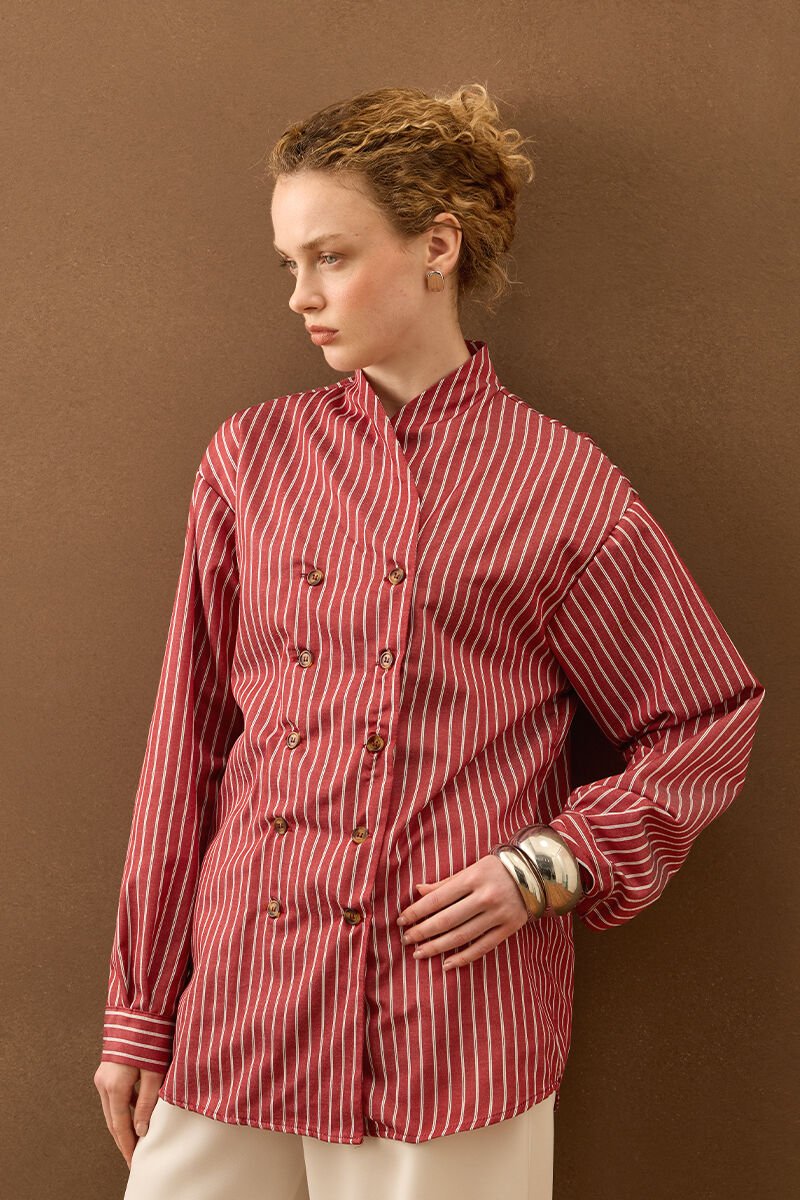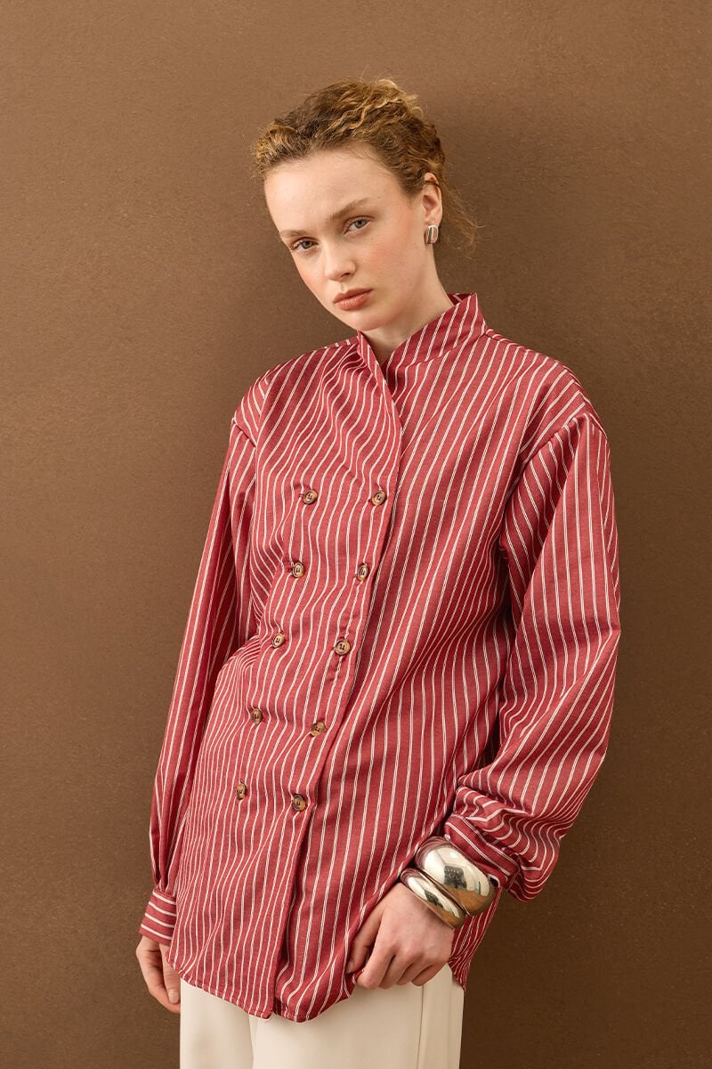 Bordo Çizgili Dik Yaka Retro Gömlek