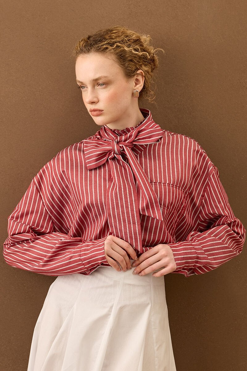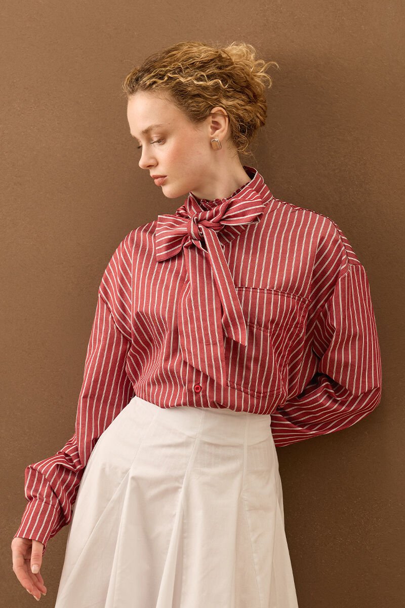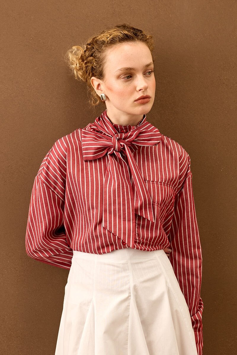 Çizgili yakası fiyonklu gömlek, zarif detaylarıyla stilinize şıklık katıyor.