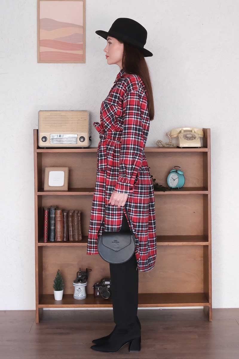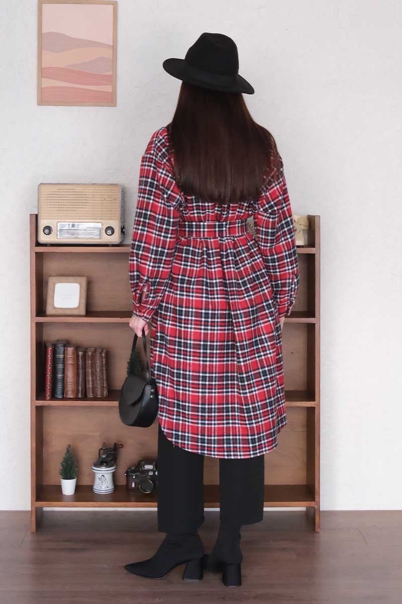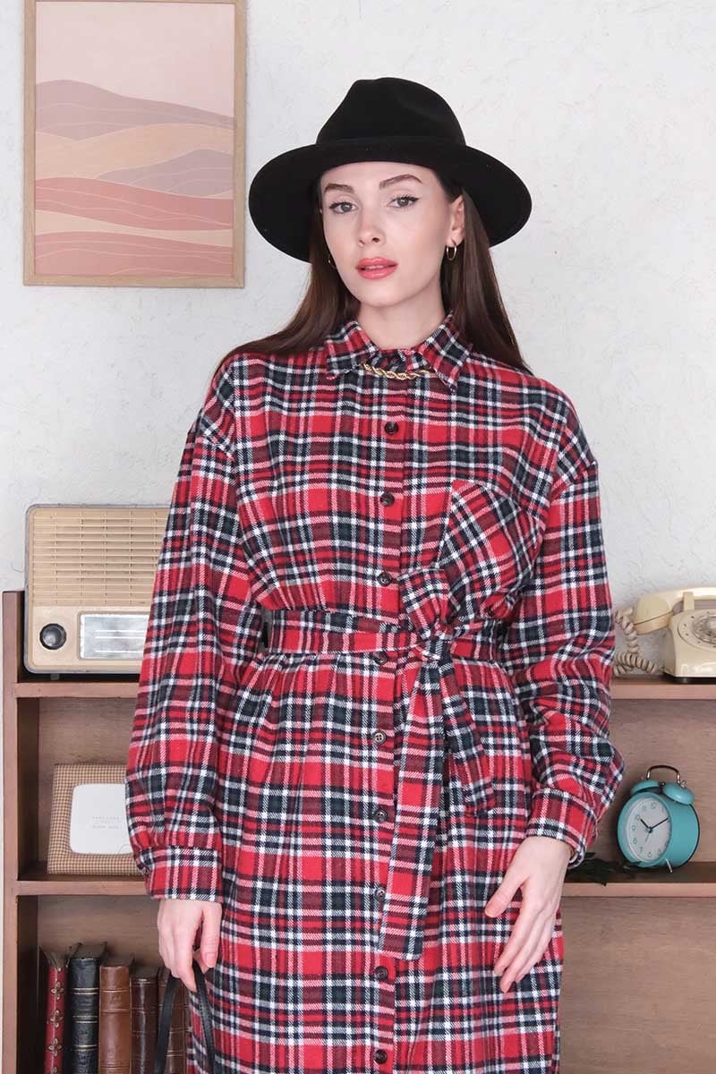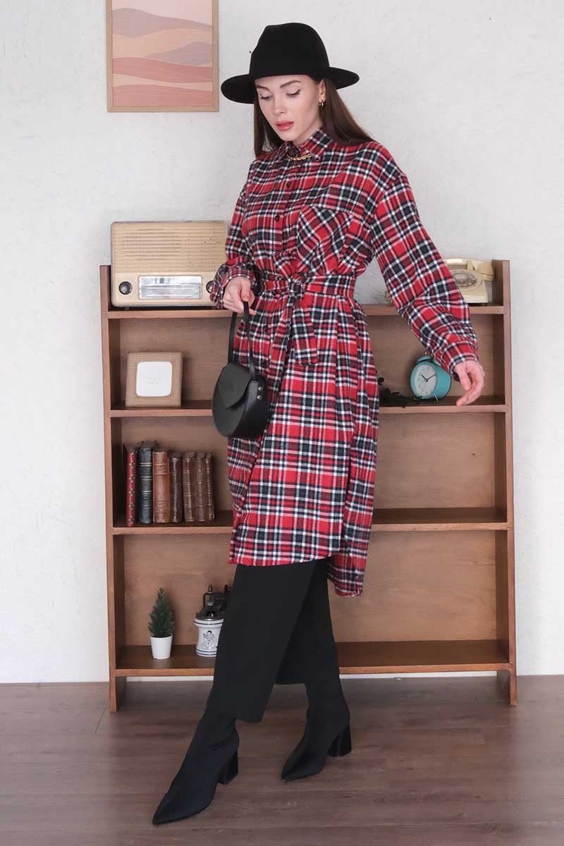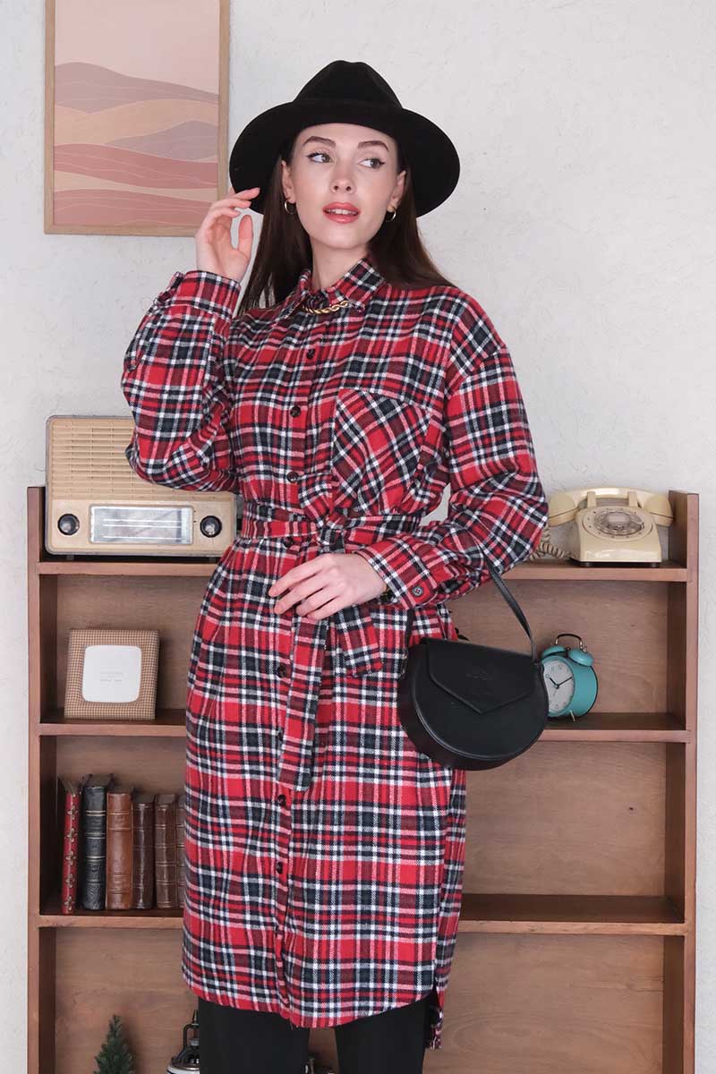 Bordo Ekose Kaşe Uzun Gömlek