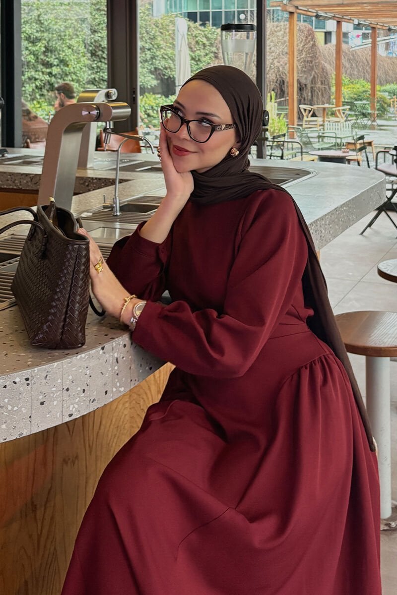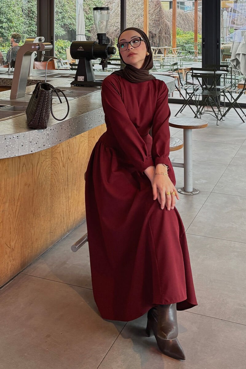 Bordo Krep Korsaj Detay Elbise