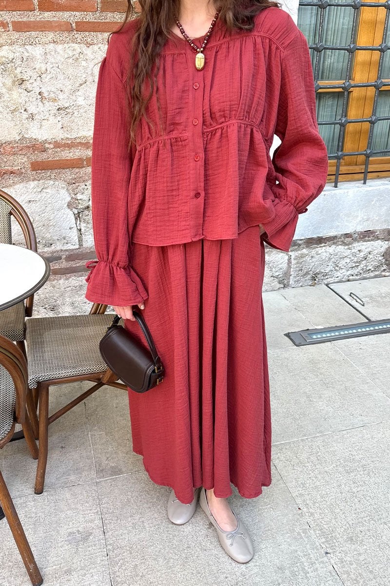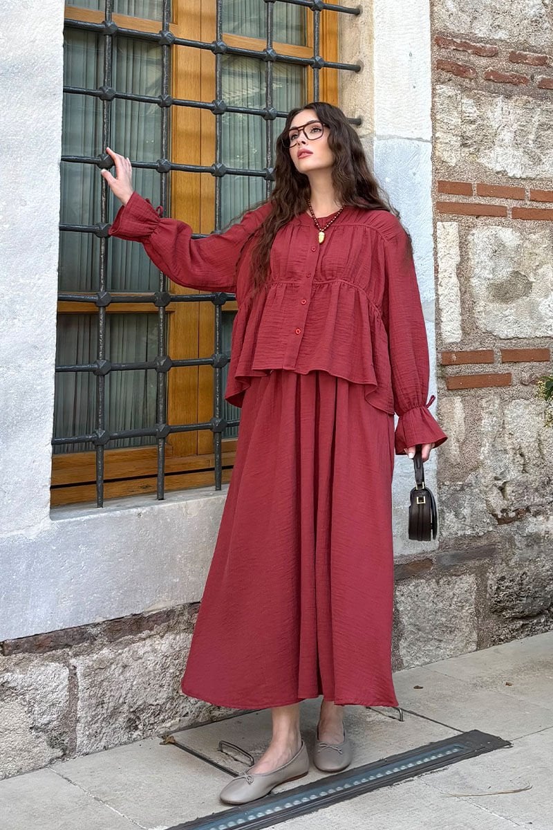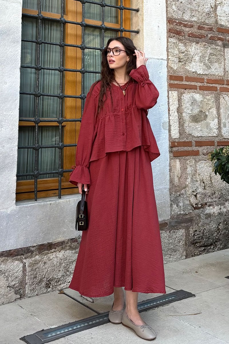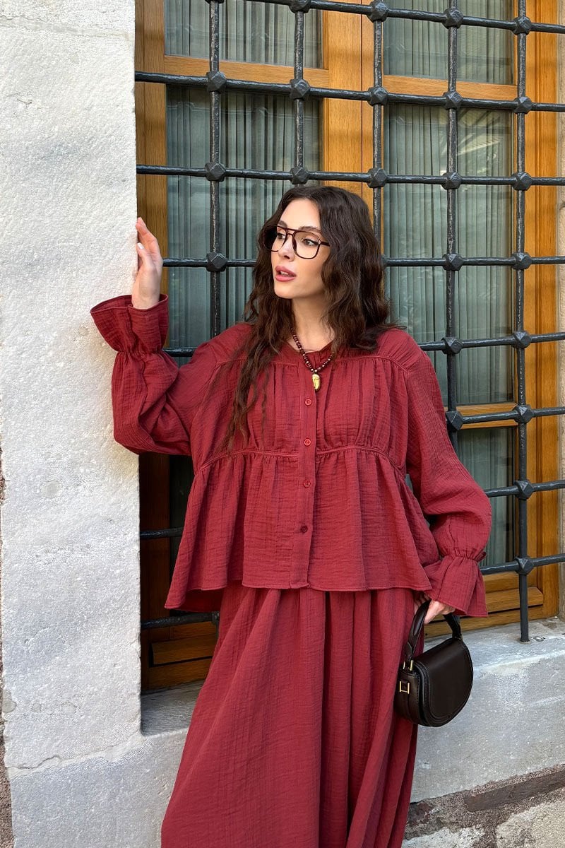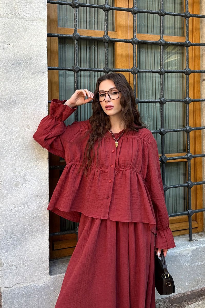 Bordo Müslin Biyeli Bluz & Balon Etek Takım