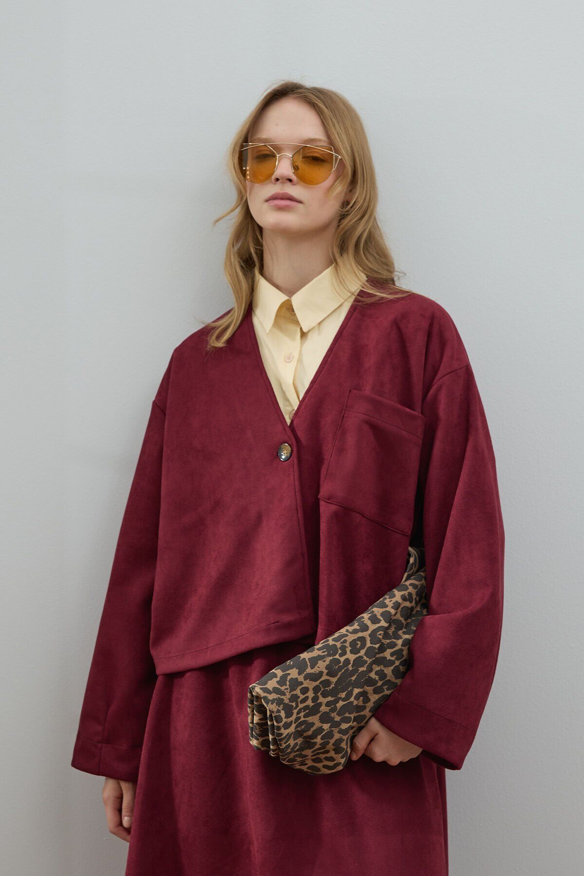 Bordo Süet Kloş Etek - Ceket Takım
