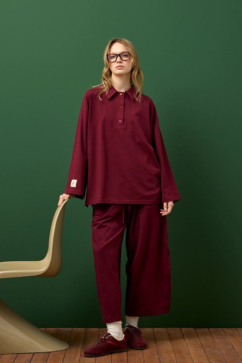 Polo yaka şalvar pantolon takım, rahatlığı ve şıklığı bir arada sunuyor.