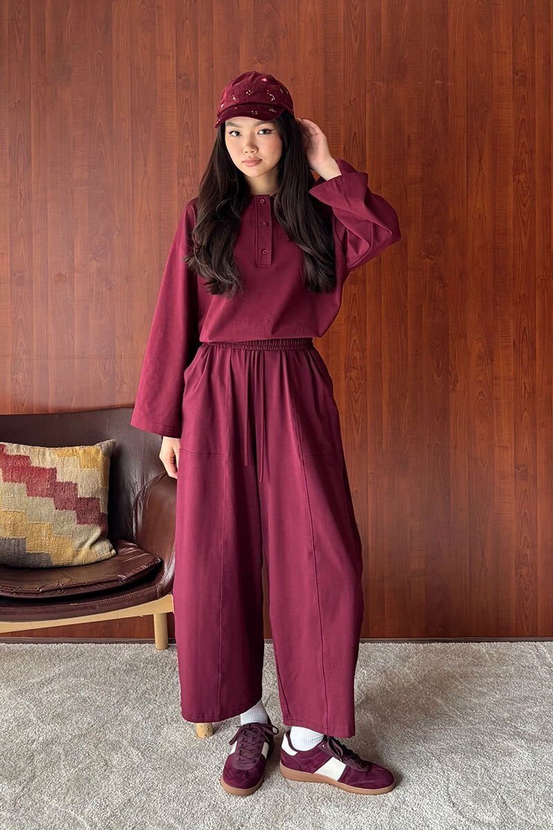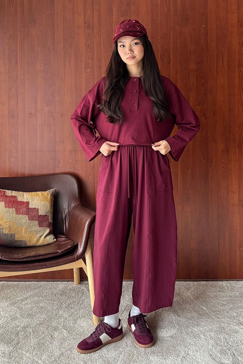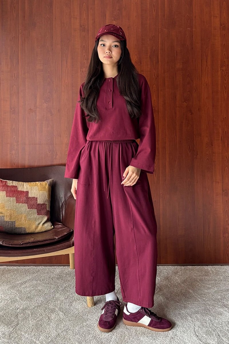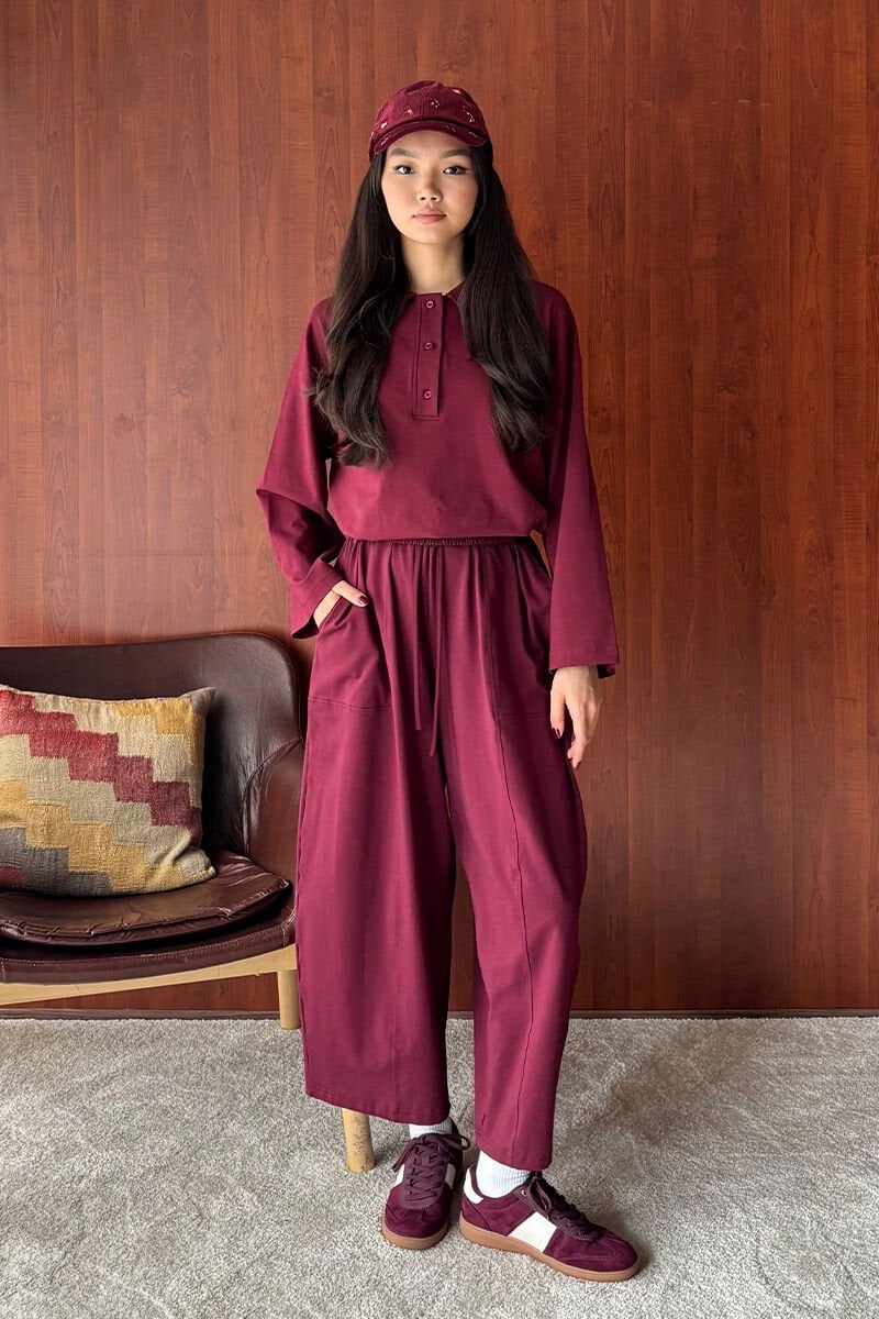 Polo yaka şalvar pantolon takım, rahatlığı ve şıklığı bir arada sunuyor.