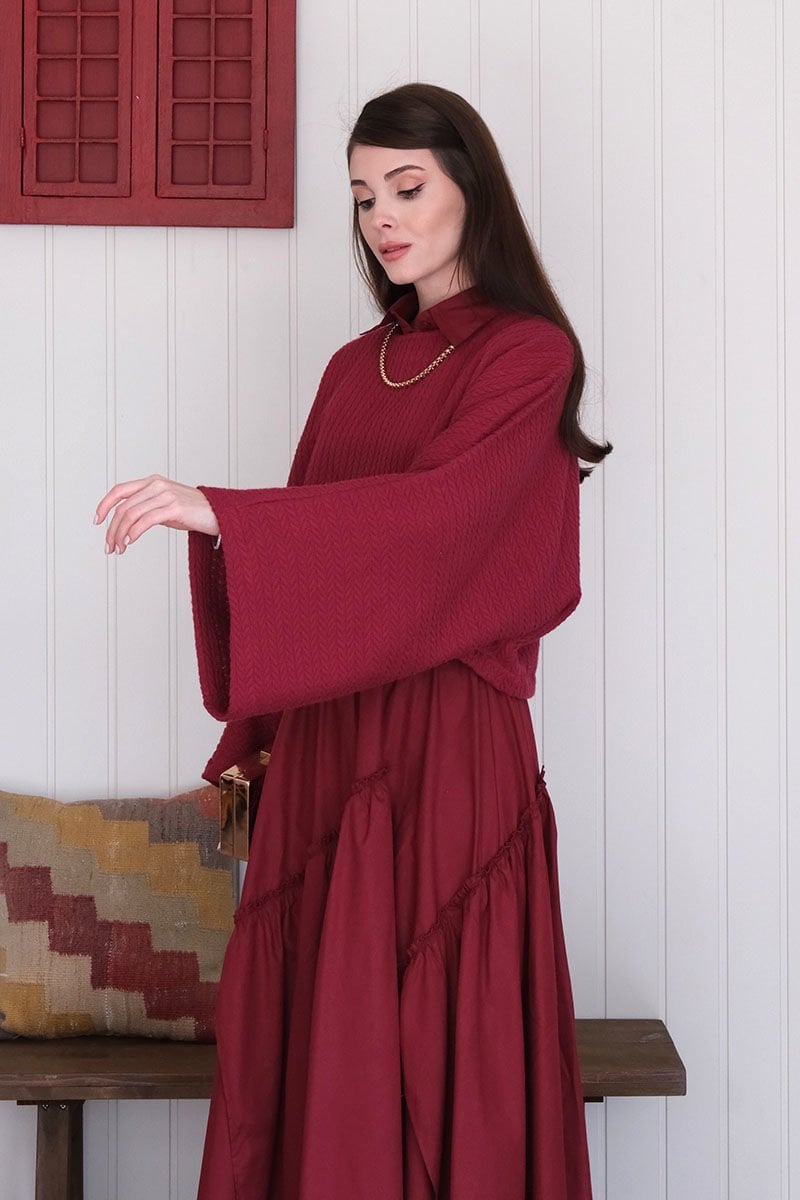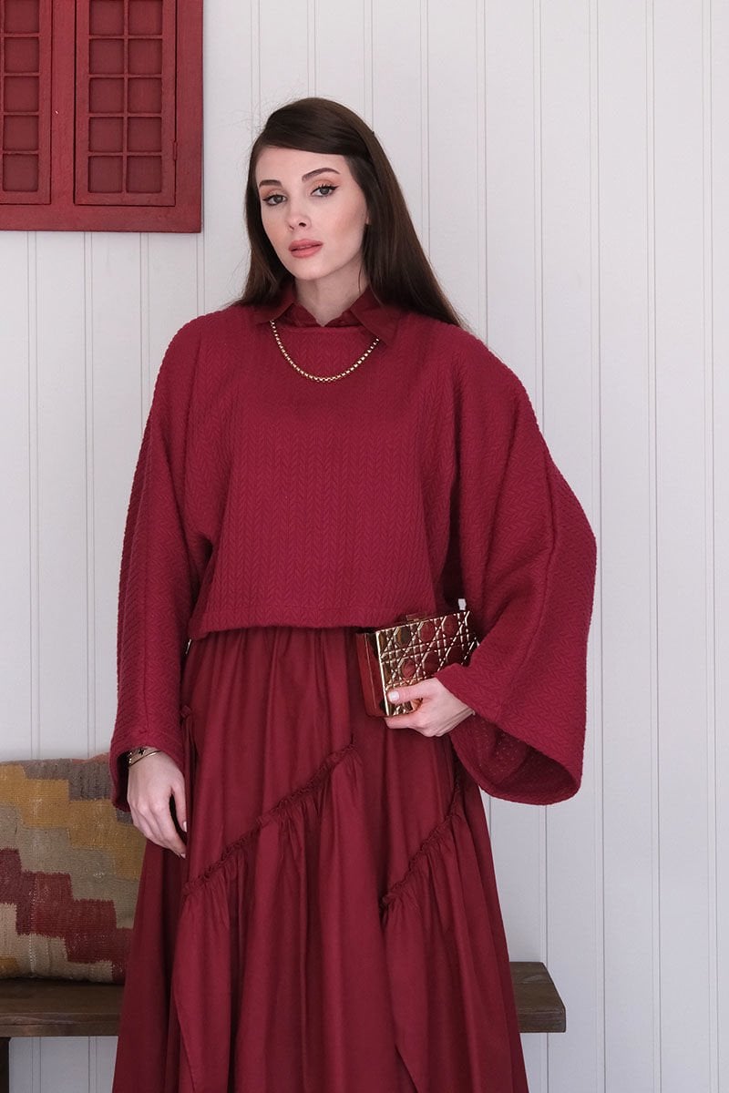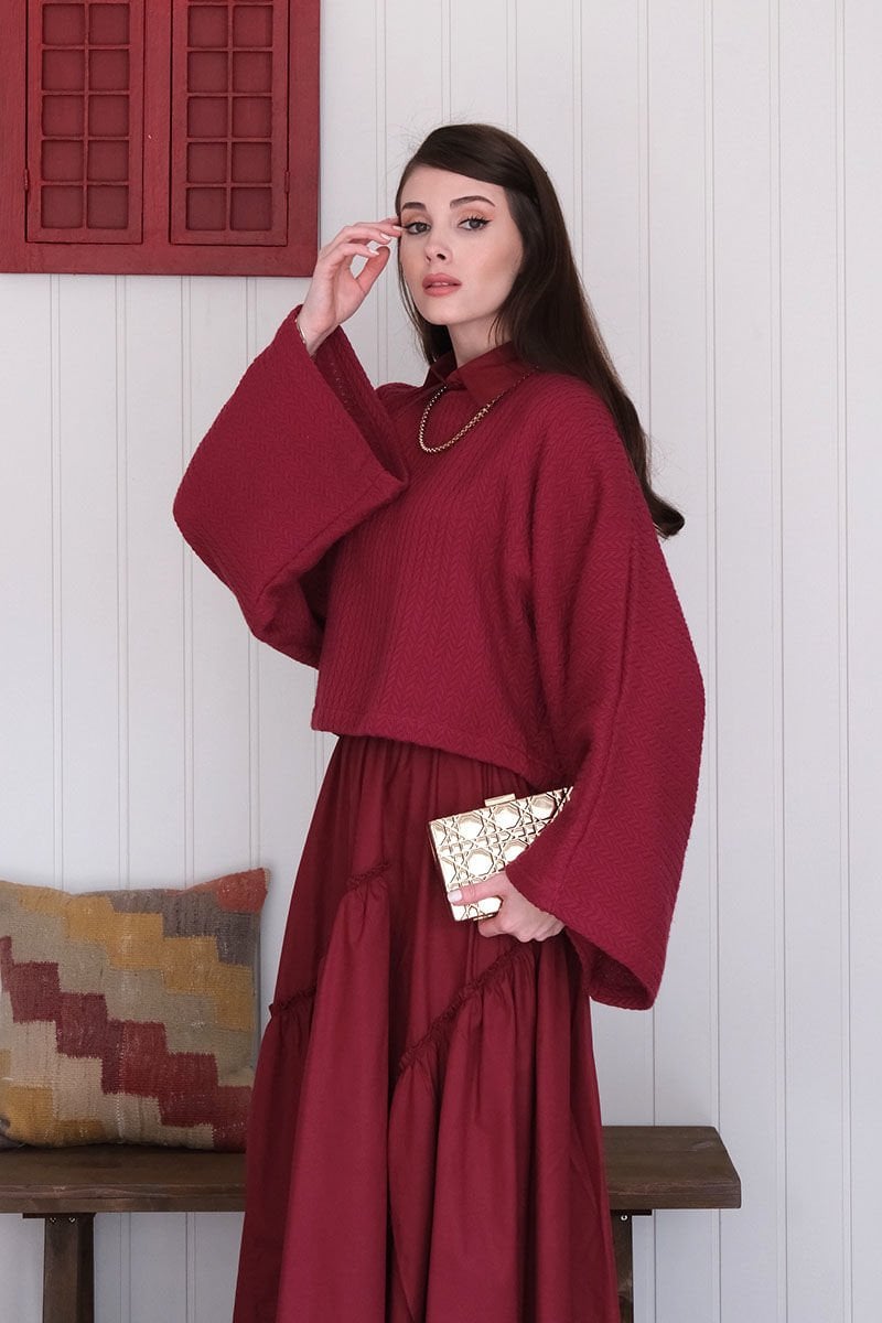 Bordo Yarasa Kol Triko Crop