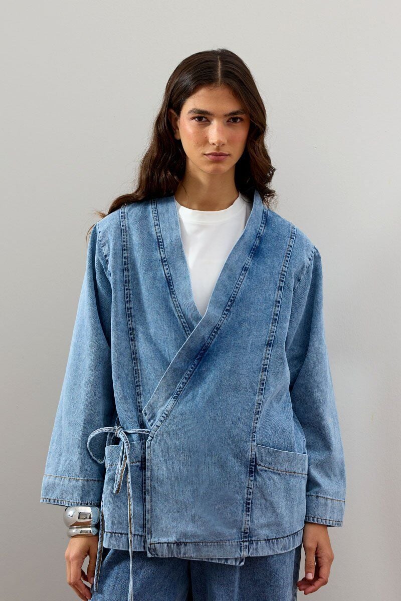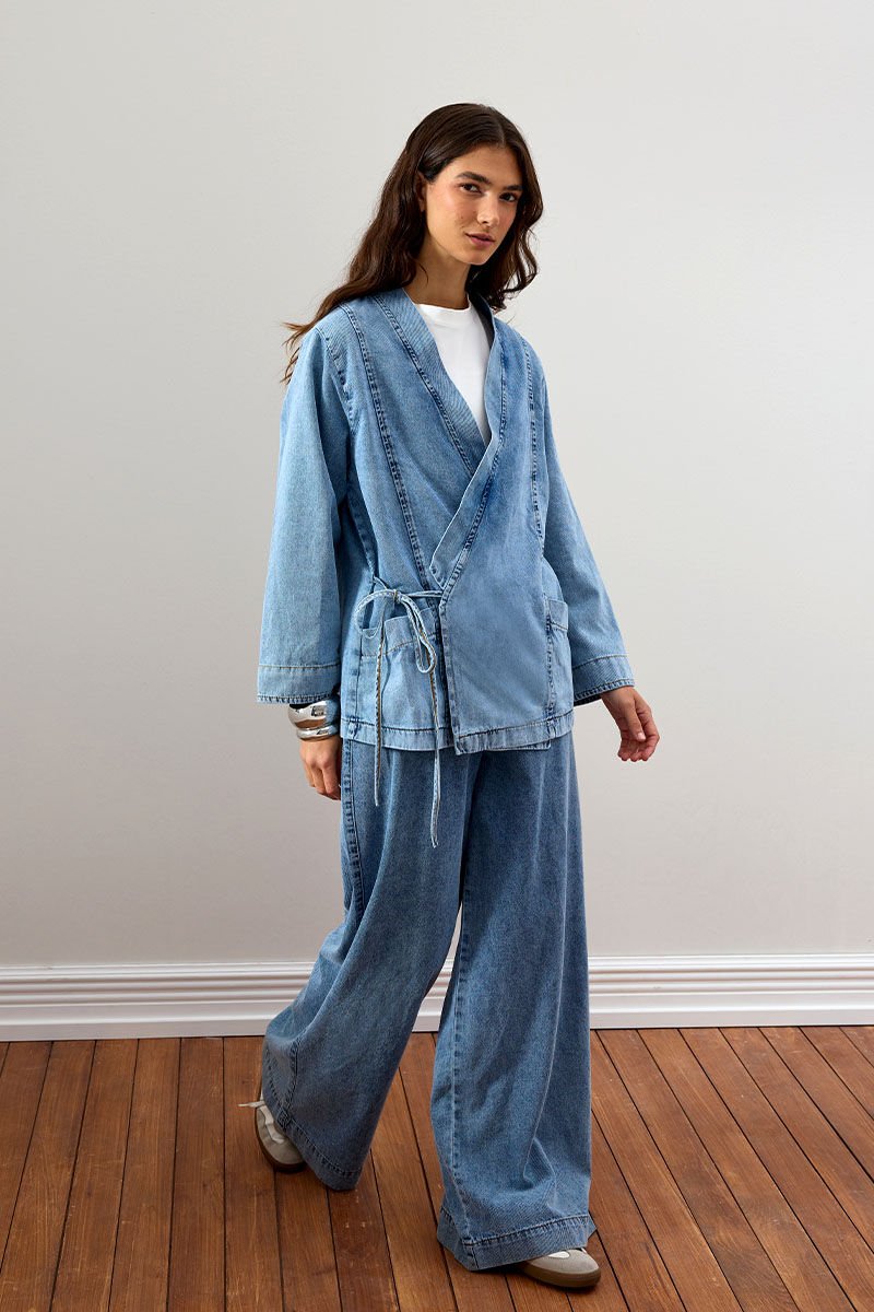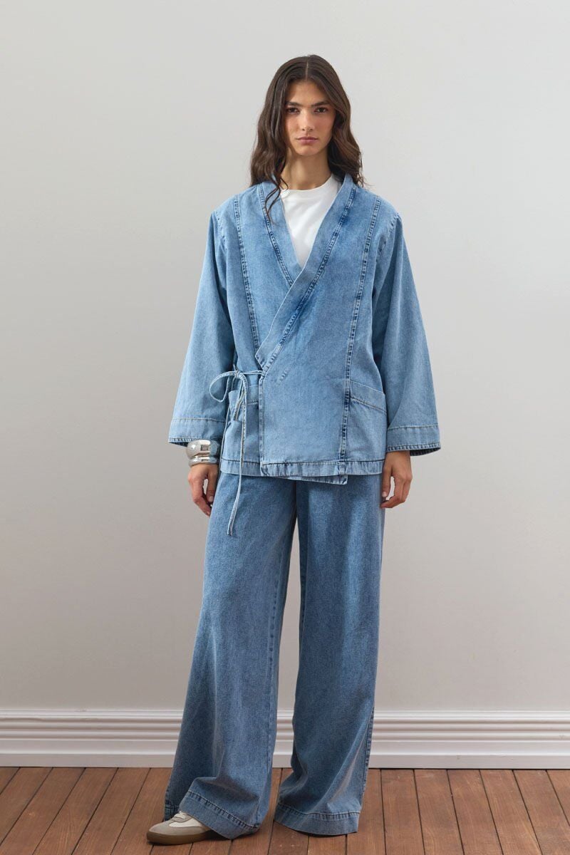 Buz Mavi Kruvaze Ceket & Buz Mavisi Bol Paça Kot Pantolon Takım