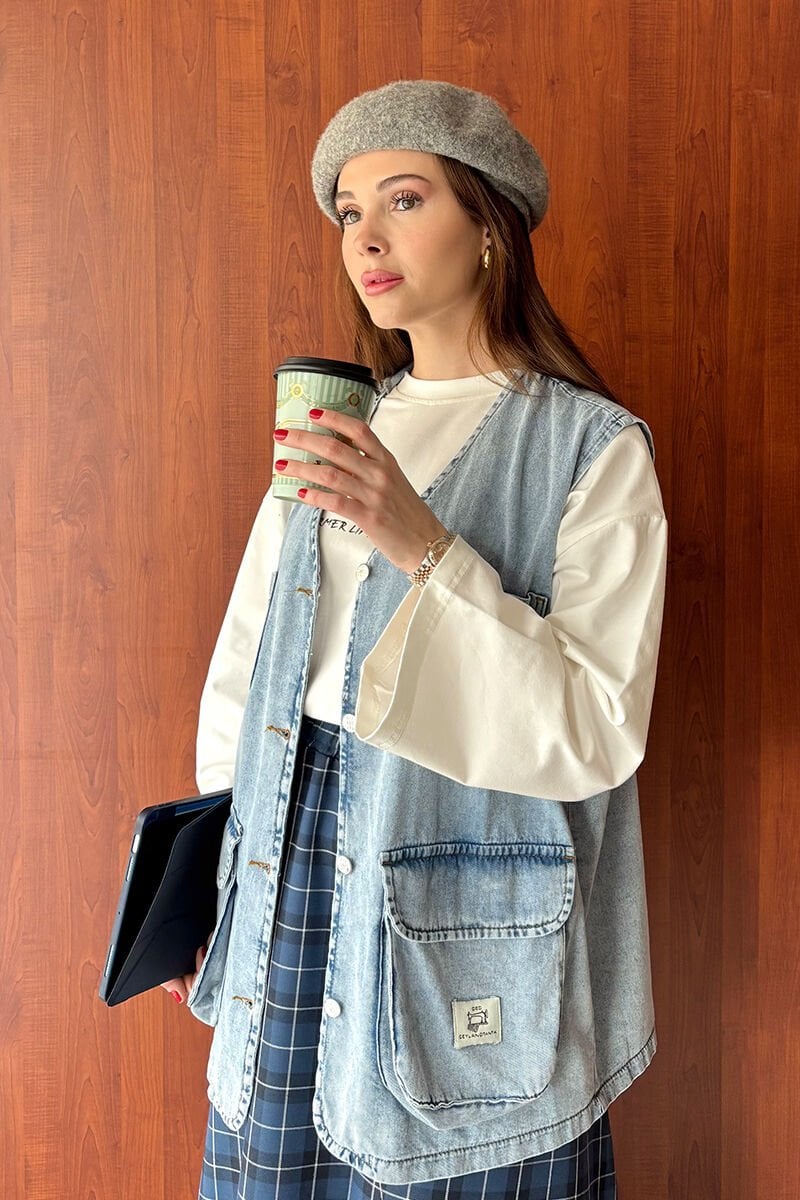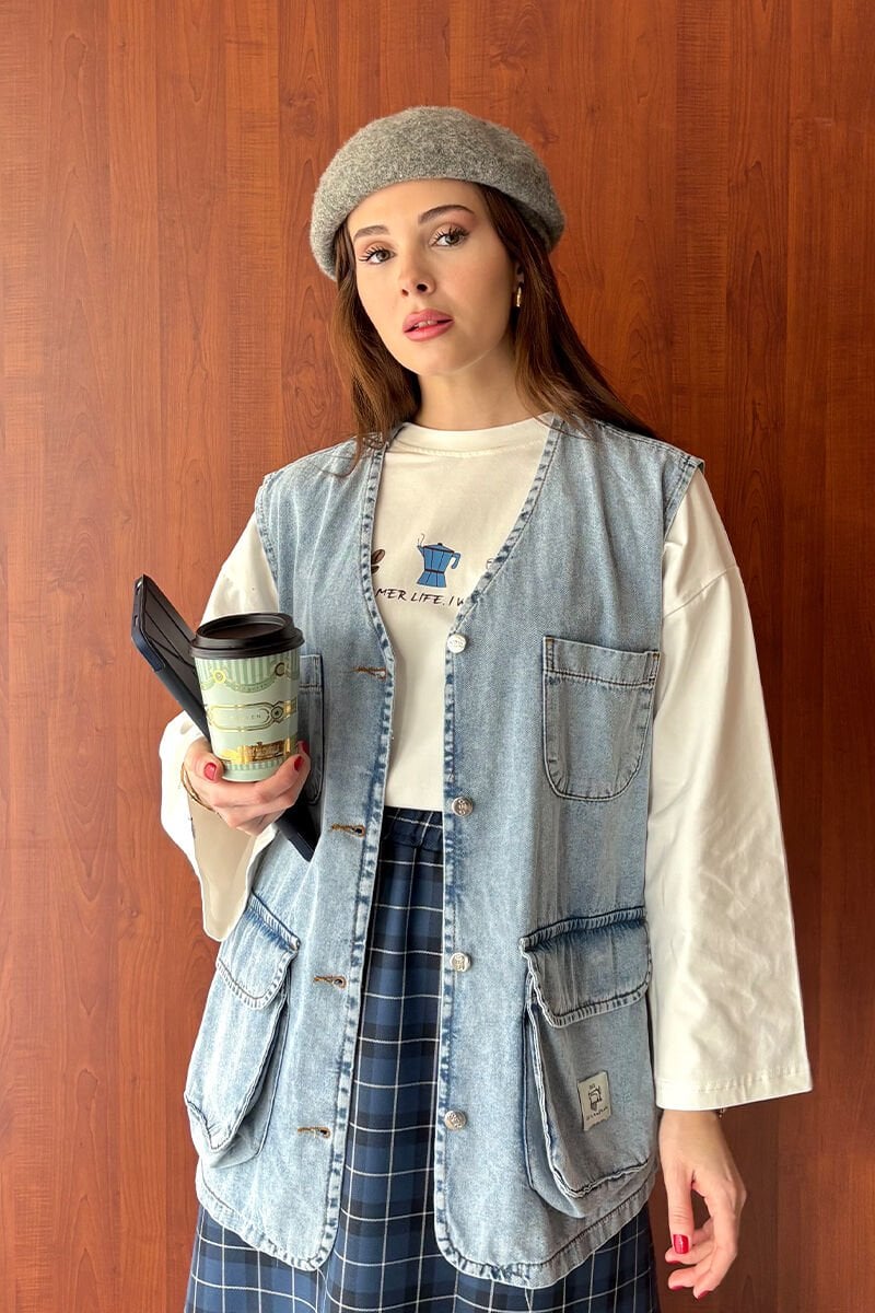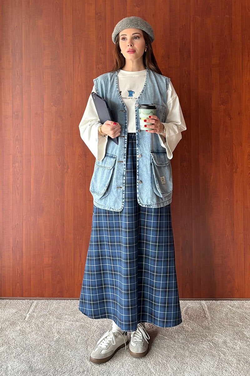 Buz Mavisi Kargo Cepli Kot Yelek & İndigo Ekose Kloş Etek Takım