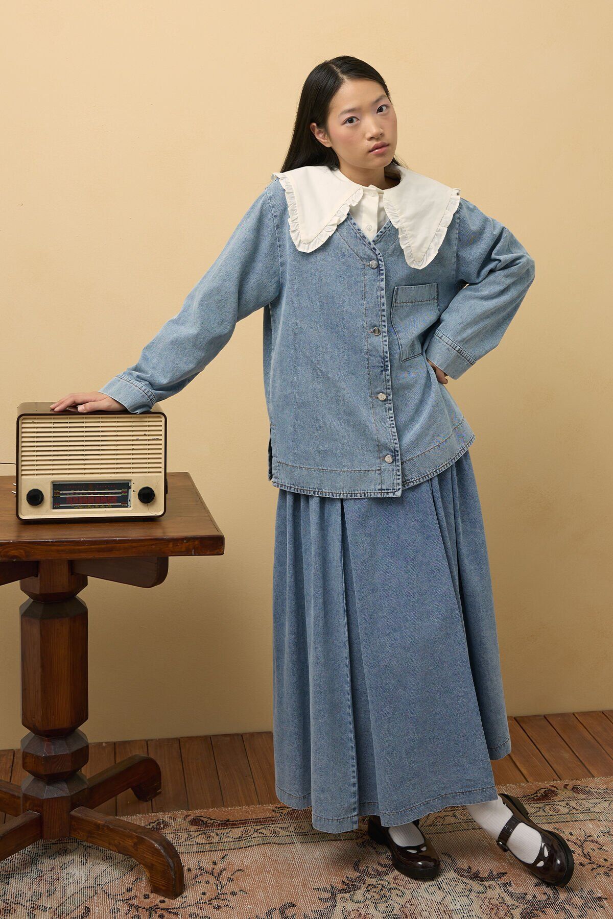Buz Mavisi Kot Blazer Ceket & Buz Mavisi Kot Pile Detay Etek Takım