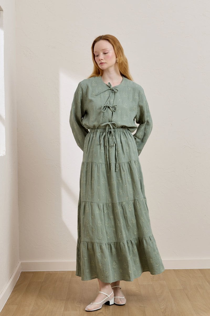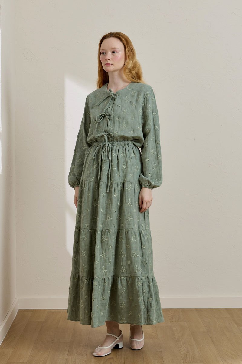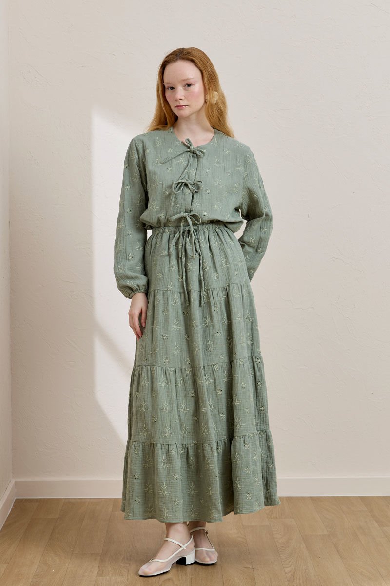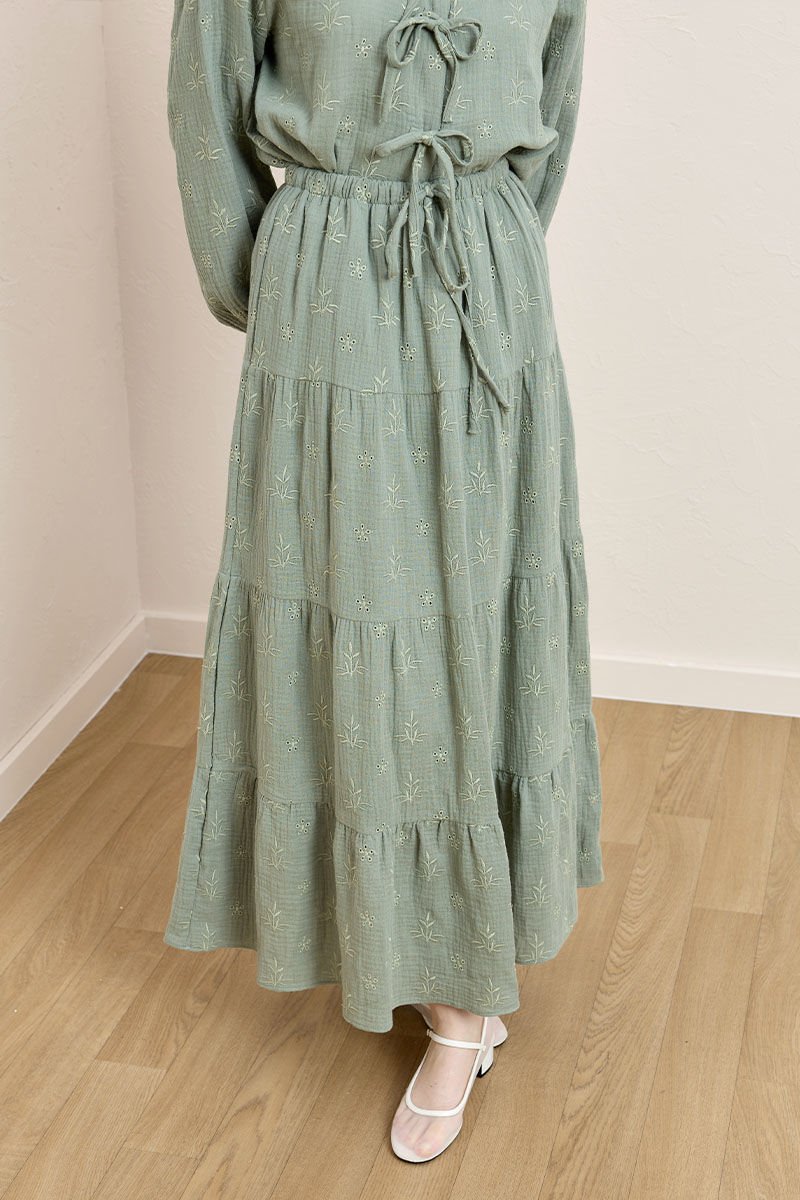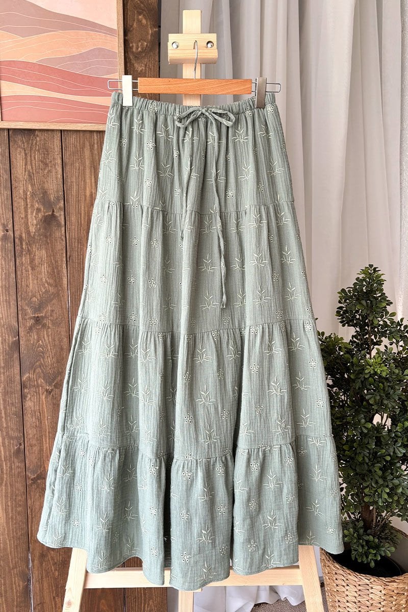 Bu zarif nakışlı müslin kat etek, rahat ve şık bir görünüm sunar.