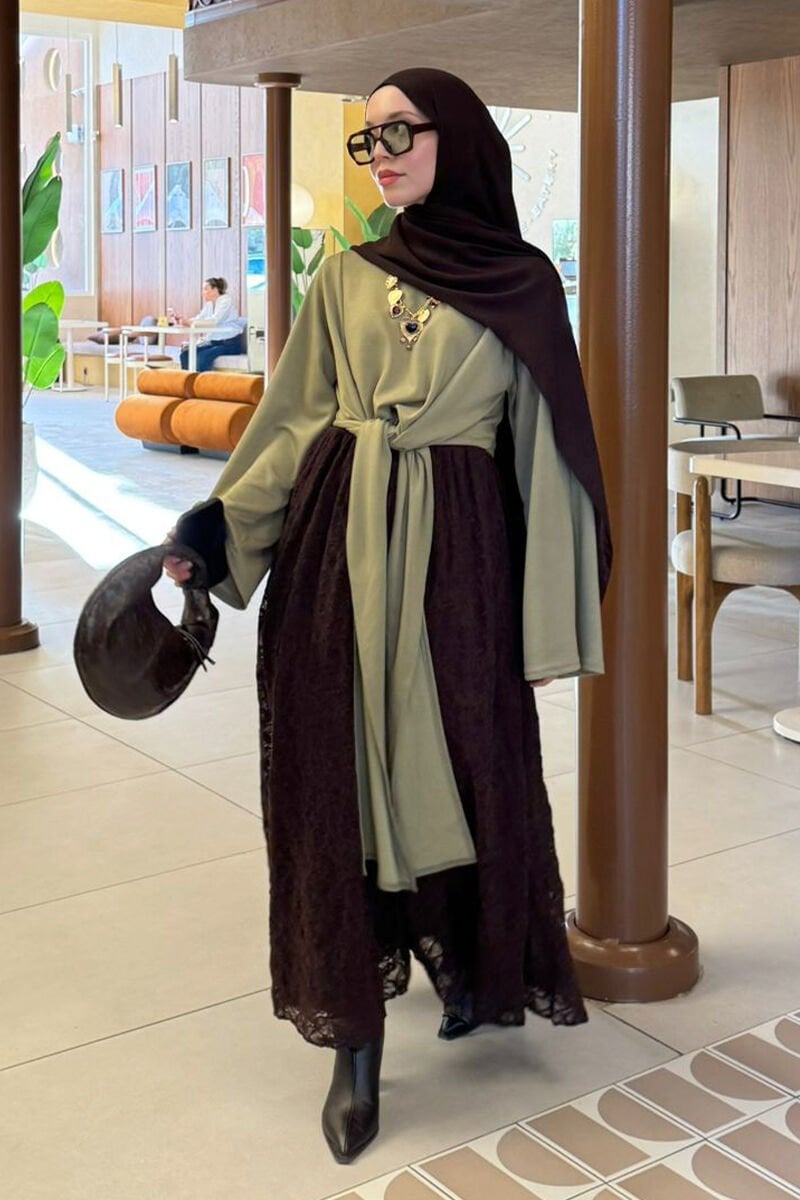 Çağla Oysho Bağlamalı Bluz & Acı Kahve Dantelli Balon Etek Takım