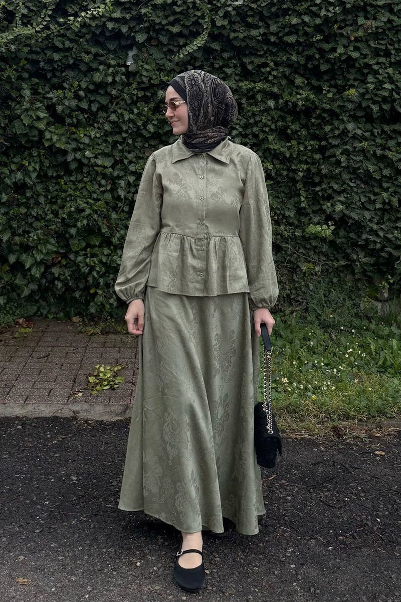 Bu şık ve modern jakarlı gömlek etek takımı, her durumda mükemmel bir görünüm sunar.