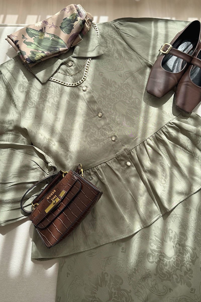 Gömleğin jakar deseni ve eteğin zarif kesimi, herkesin dikkatini çekecek.