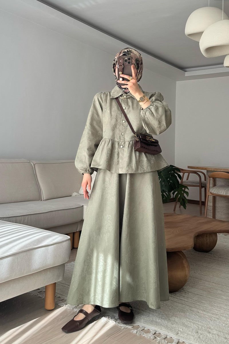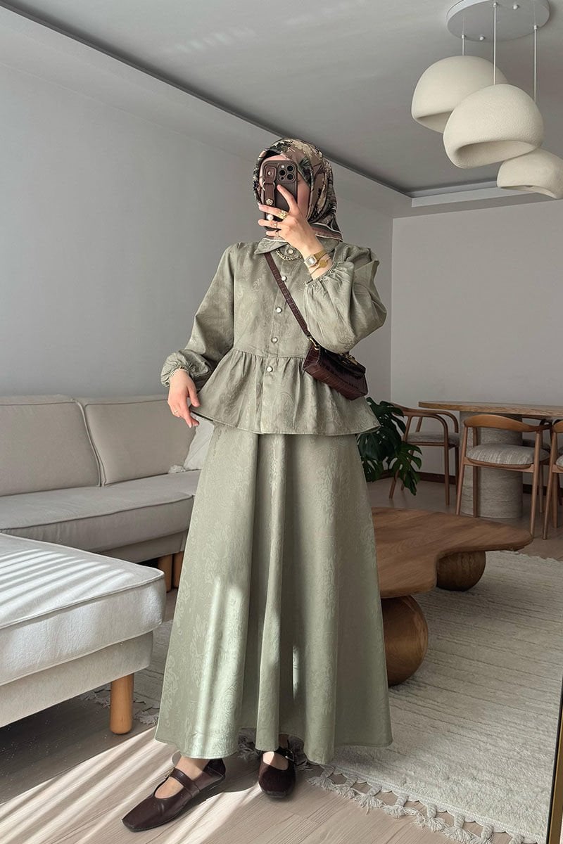 Bu şık ve modern jakarlı gömlek etek takımı, her durumda mükemmel bir görünüm sunar.