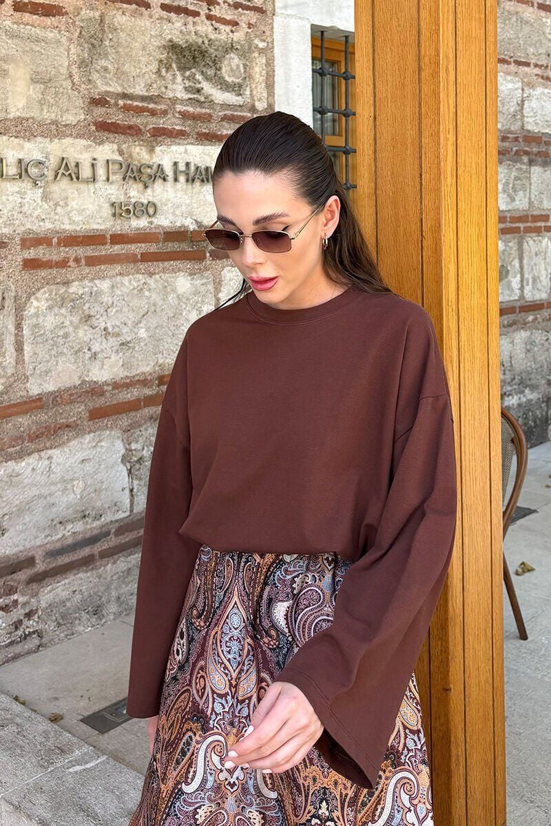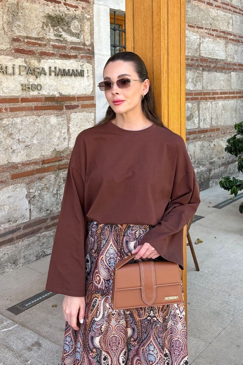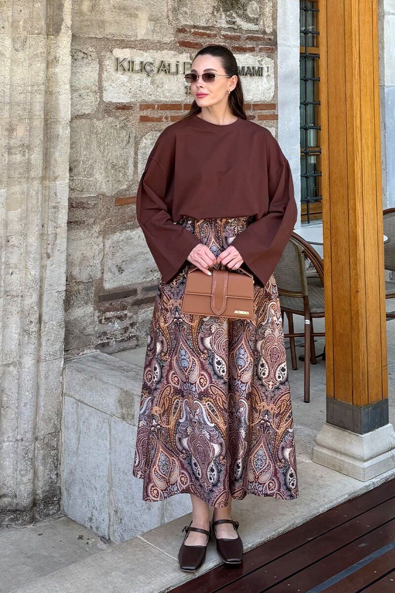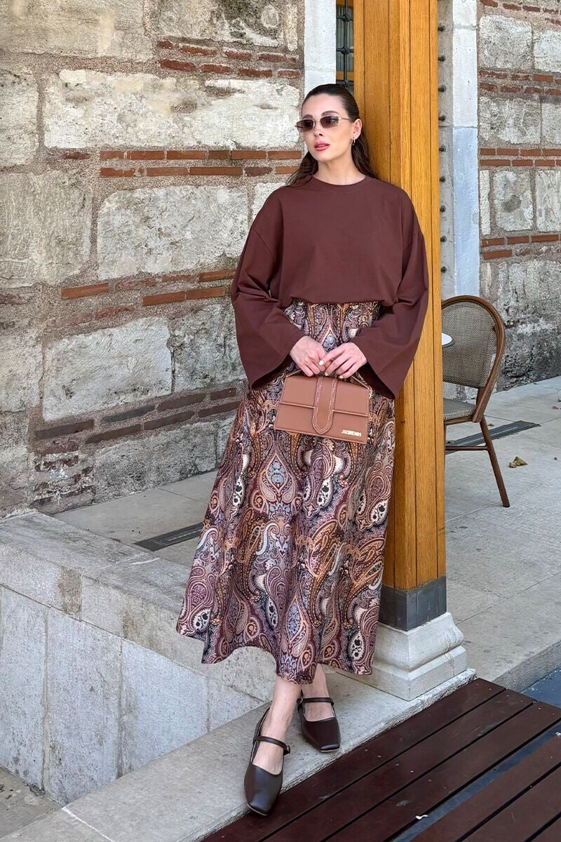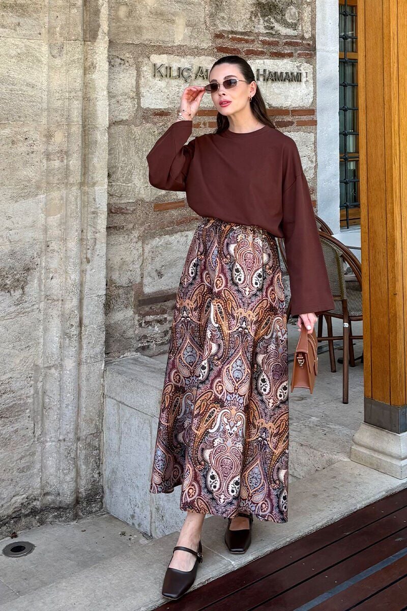 Camel Etnik Desen Pamuk Saten Kloş Etek