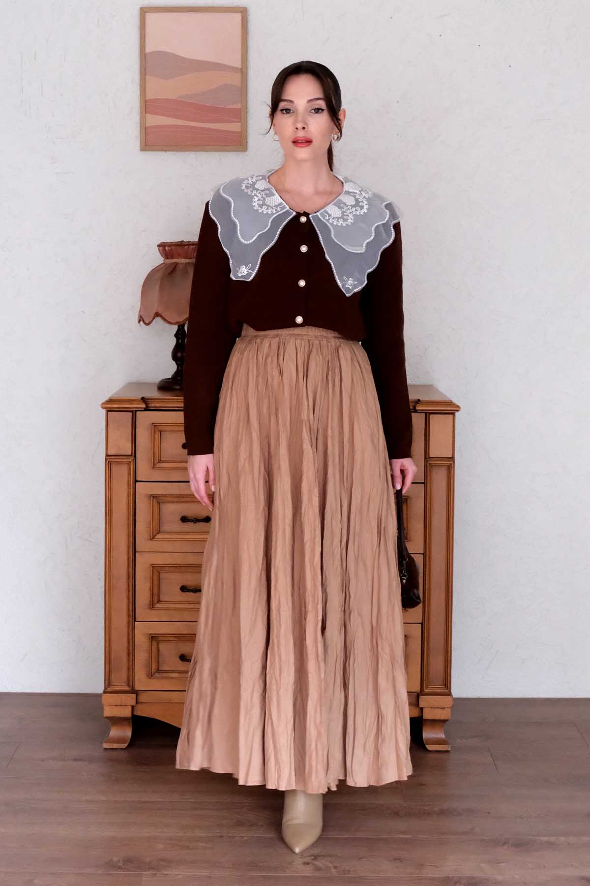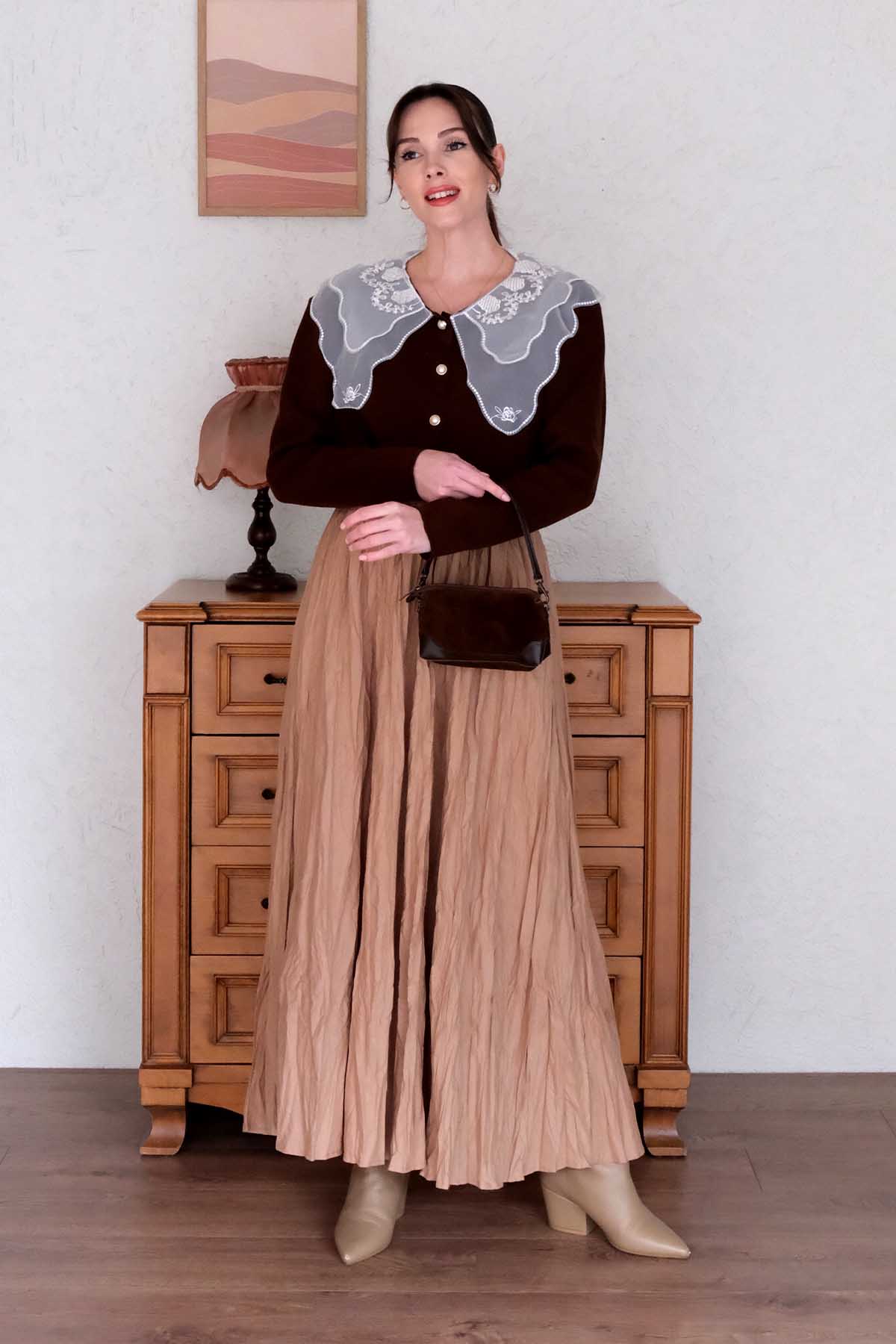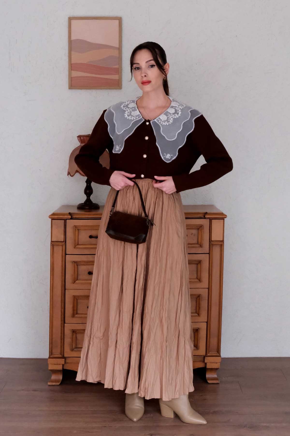 Dantel Yakalı Acı Kahve Triko Hırka