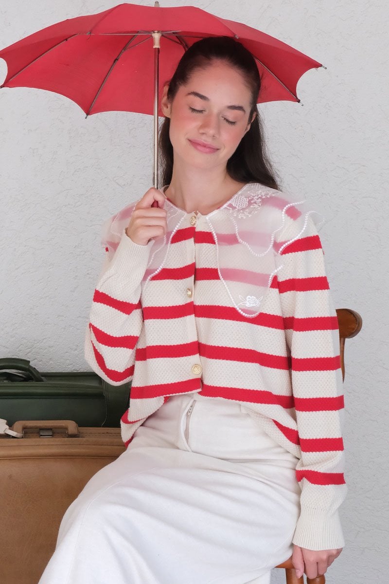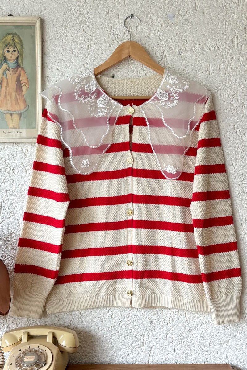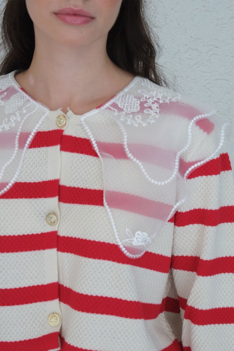 Dantel Yakalı Çizgili Kırmızı Triko Hırka