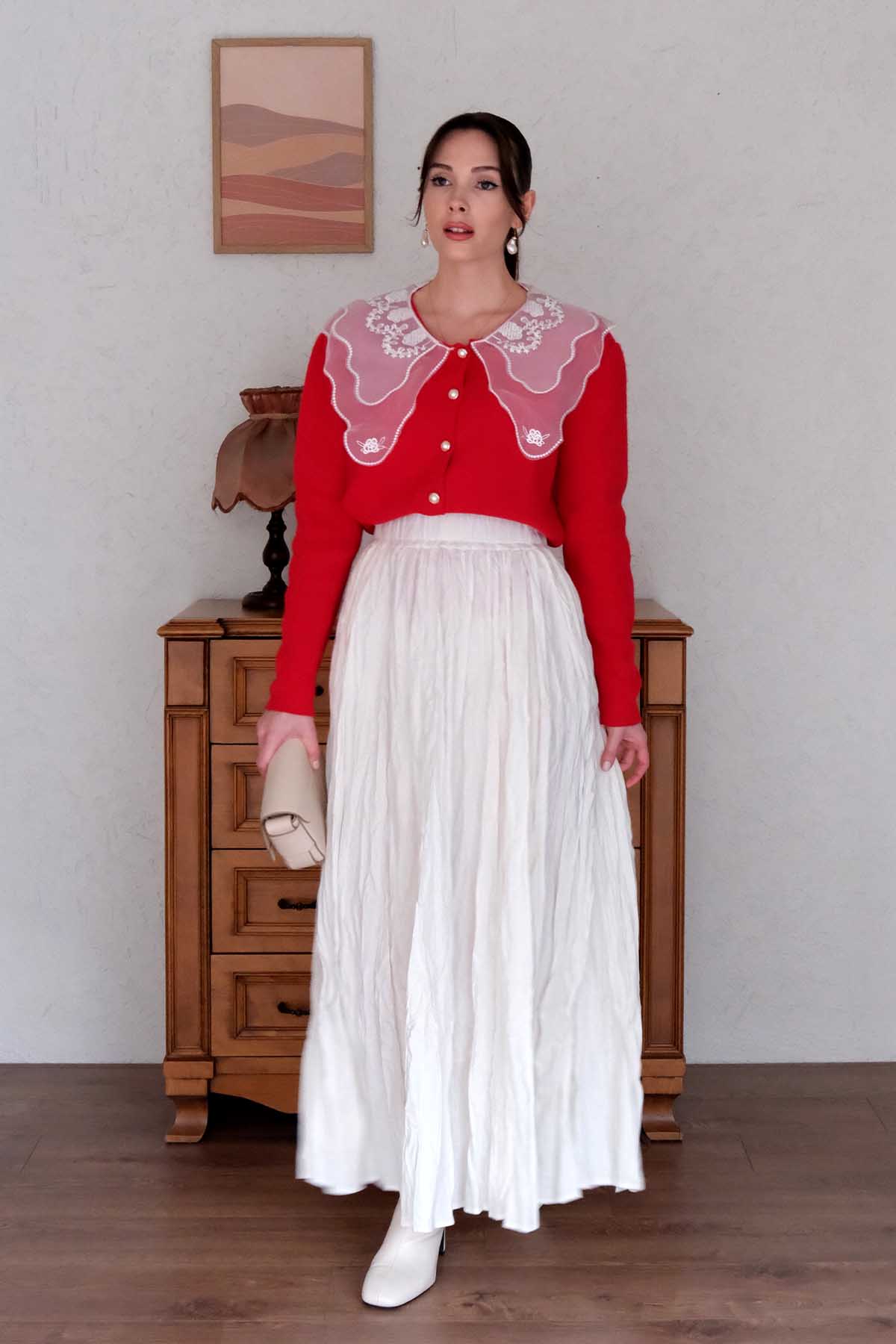Dantel Yakalı Kırmızı Triko Hırka