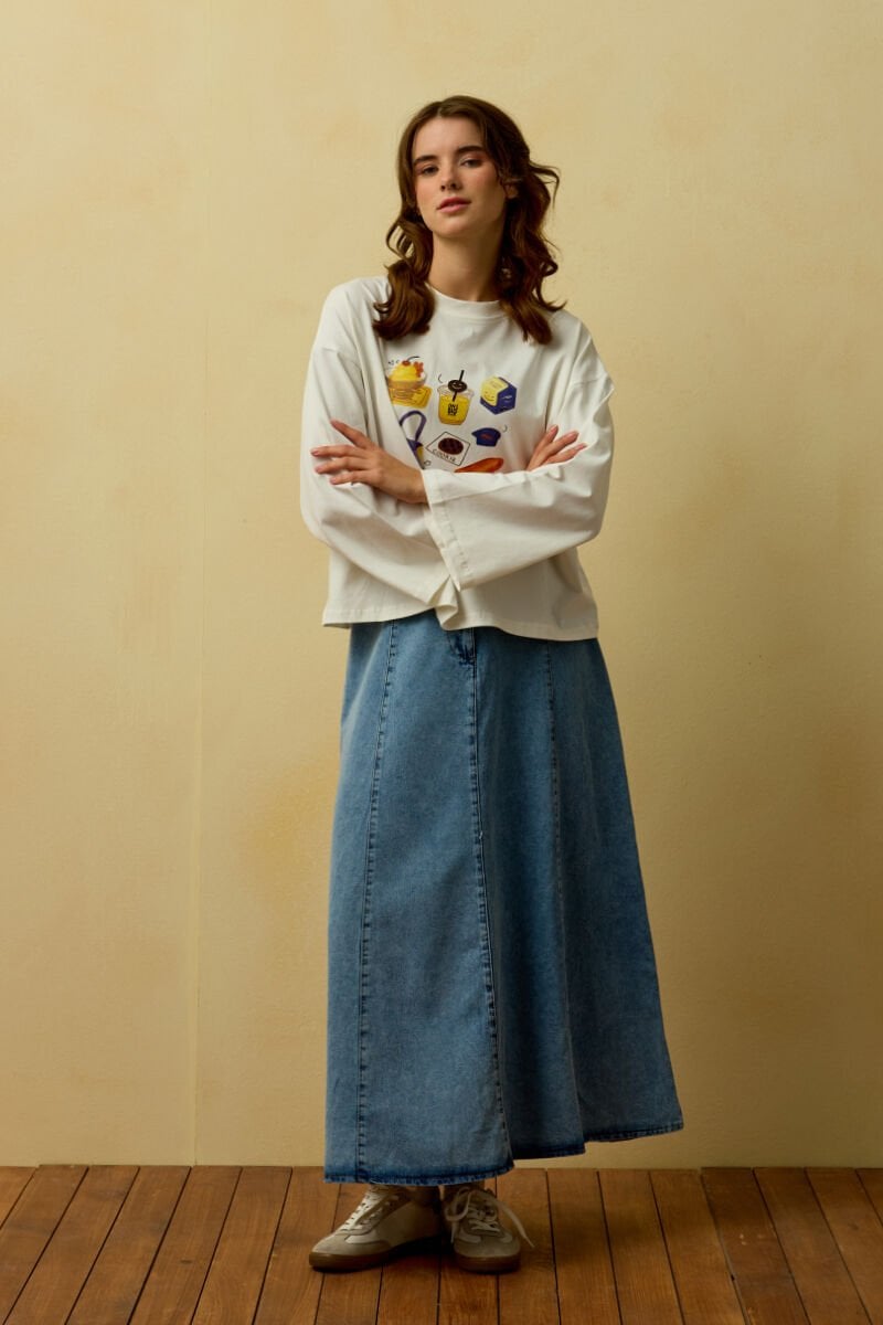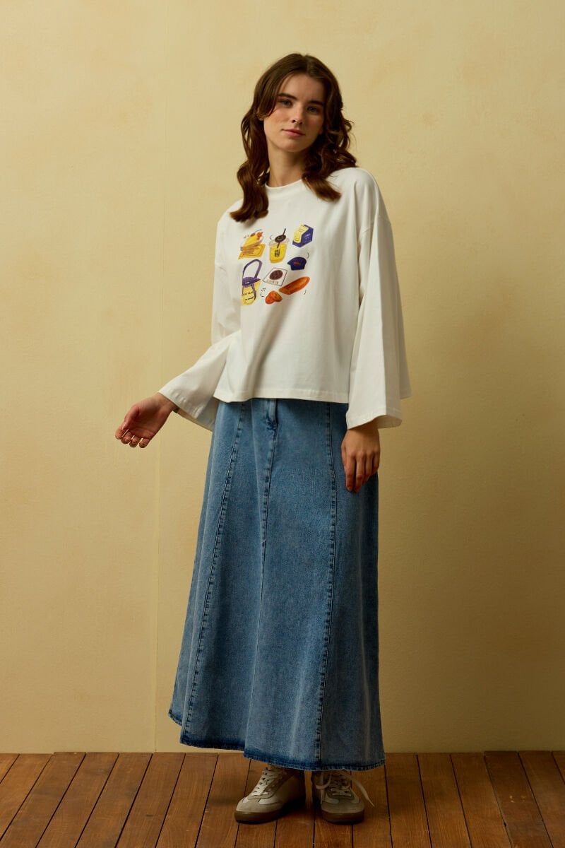Ekru Cookie Baskılı Basic Body & Buz Mavi Kot Tek Düğmeli Etek Takım