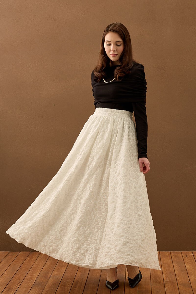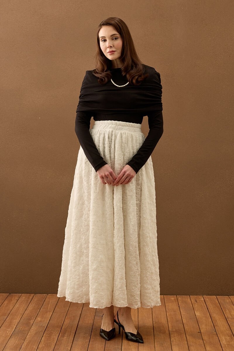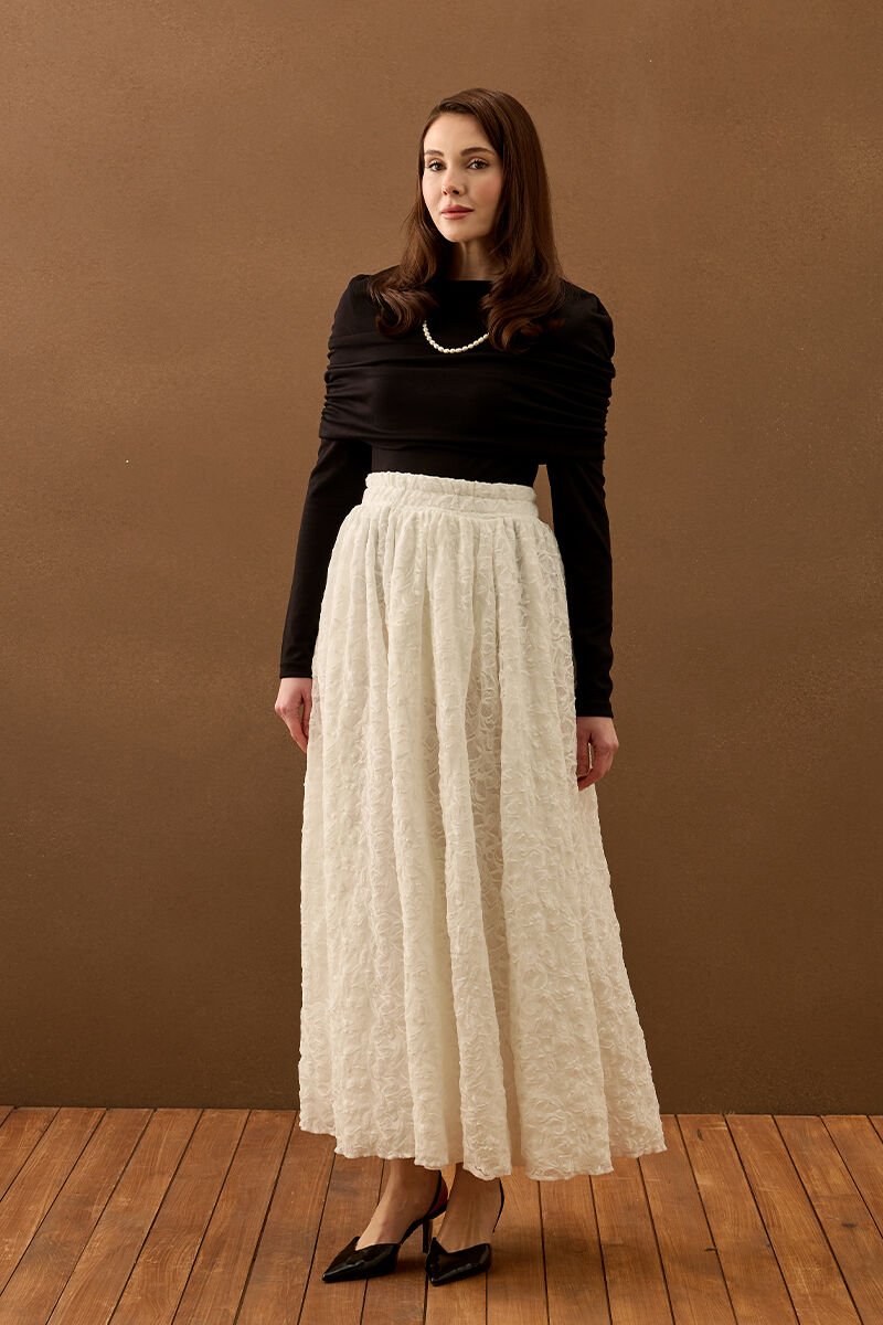 Dantelli balon etek, zarif ve şık tasarımıyla dikkat çeker.