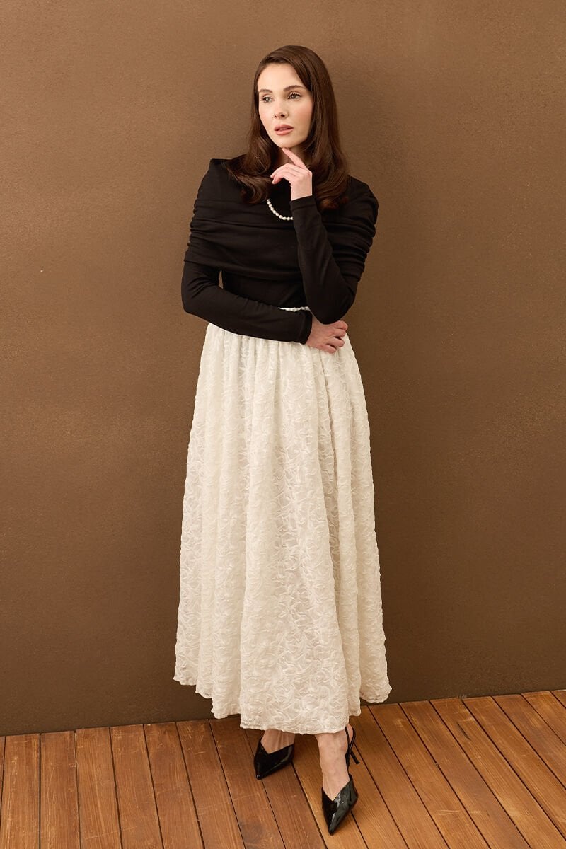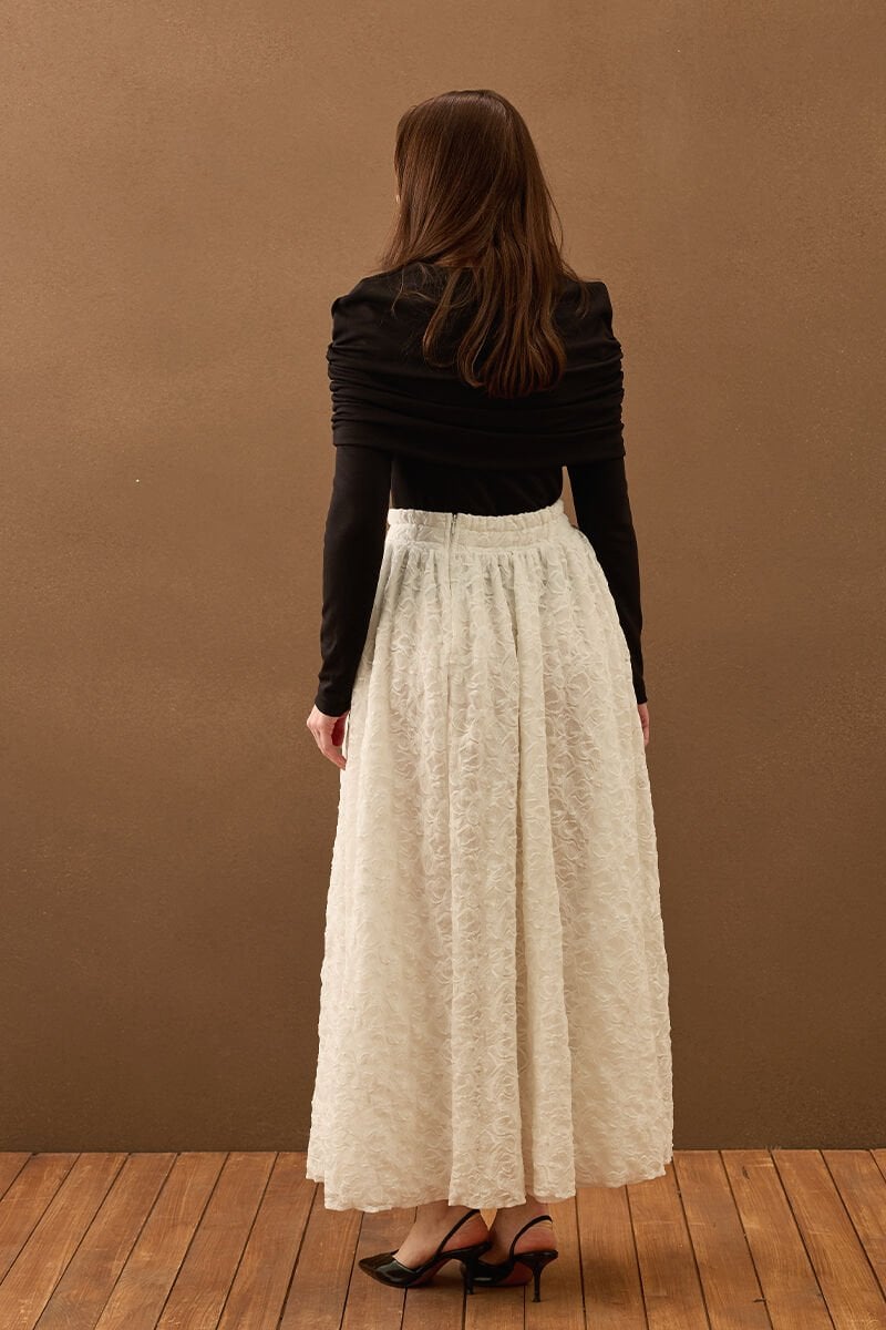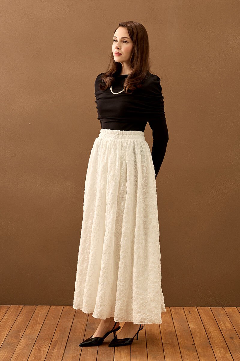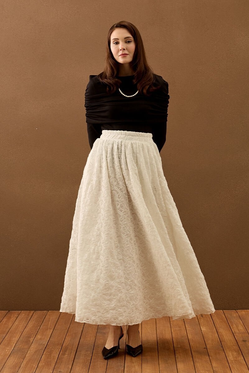 Dantelli balon etek, zarif ve şık tasarımıyla dikkat çeker.