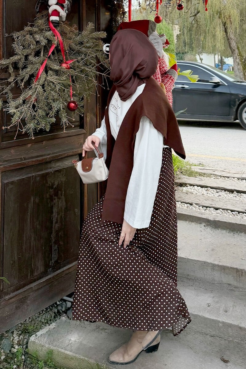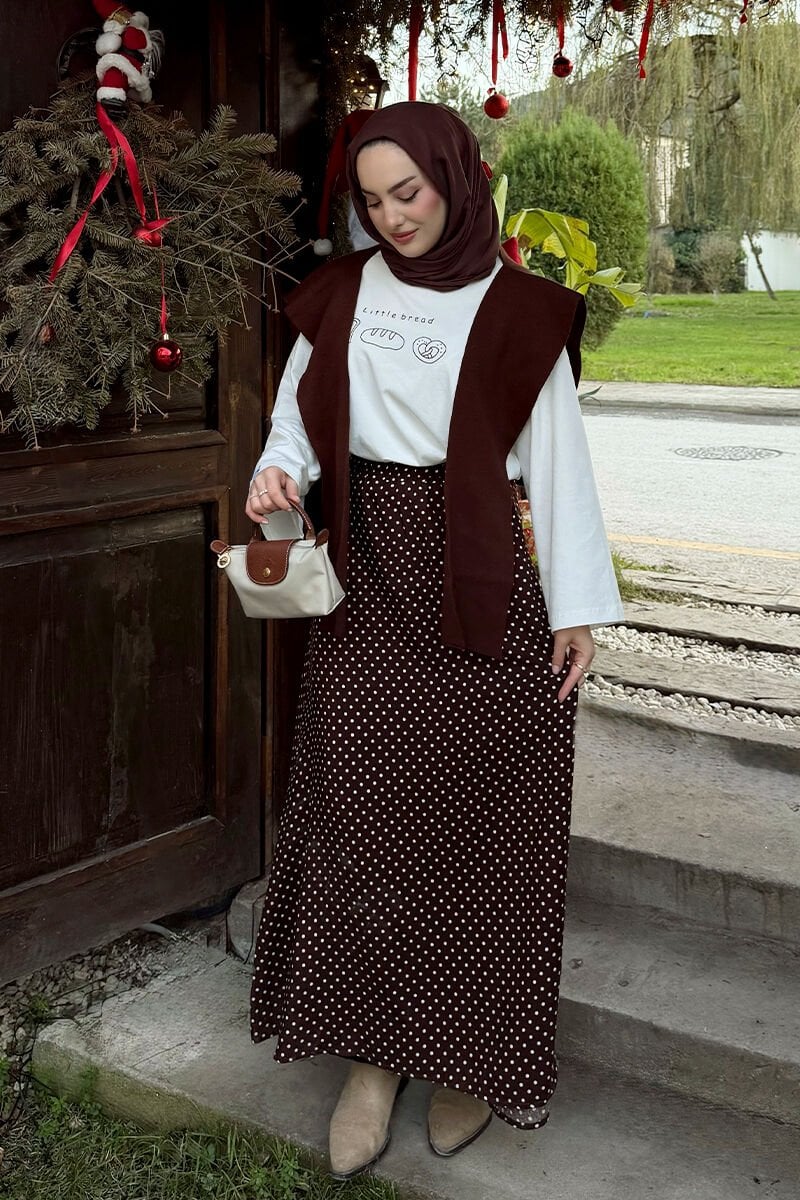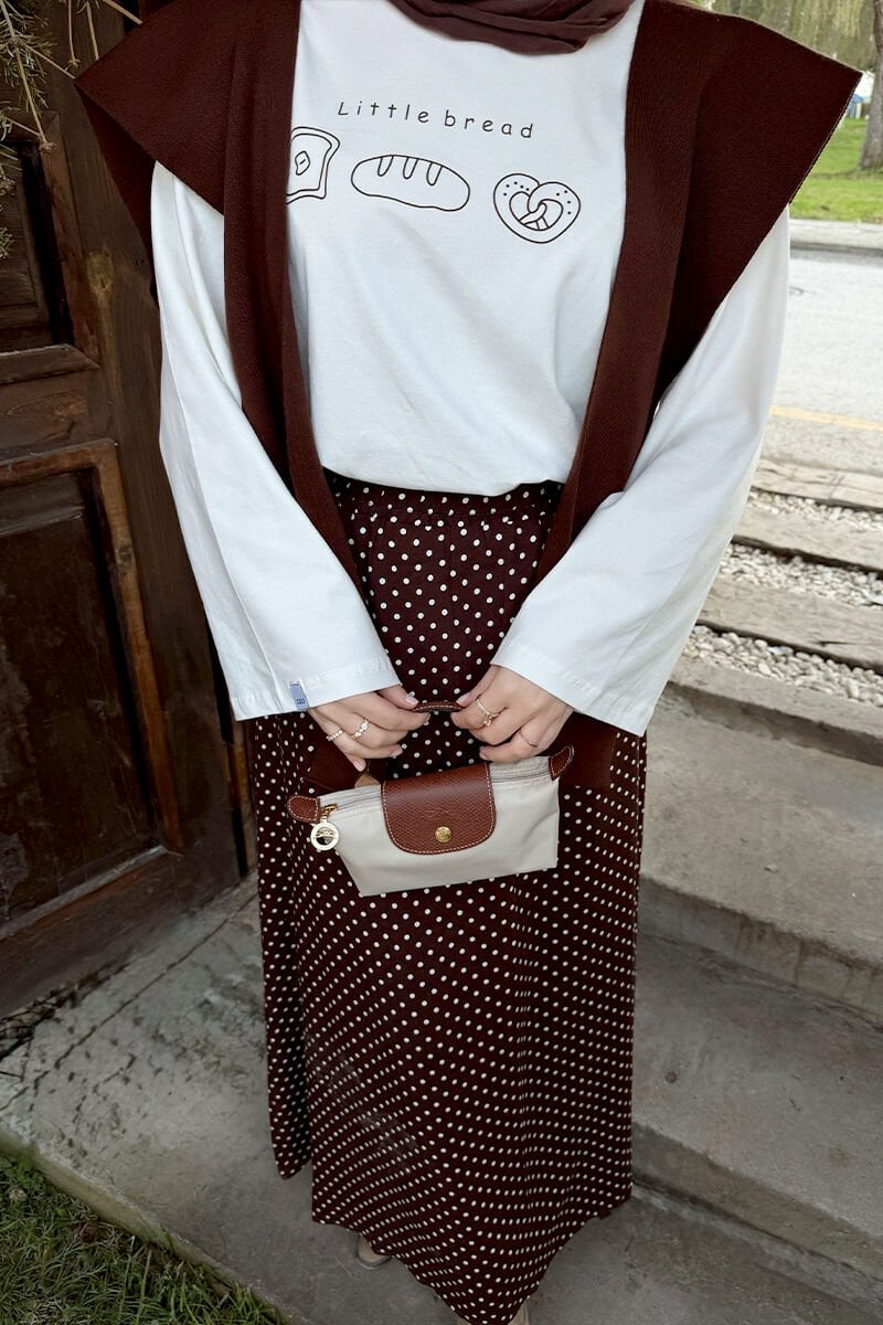 Ekru Little Bread Baskılı Basic Body & Acı Kahve Viskon Puantiye Detaylı Etek Takım