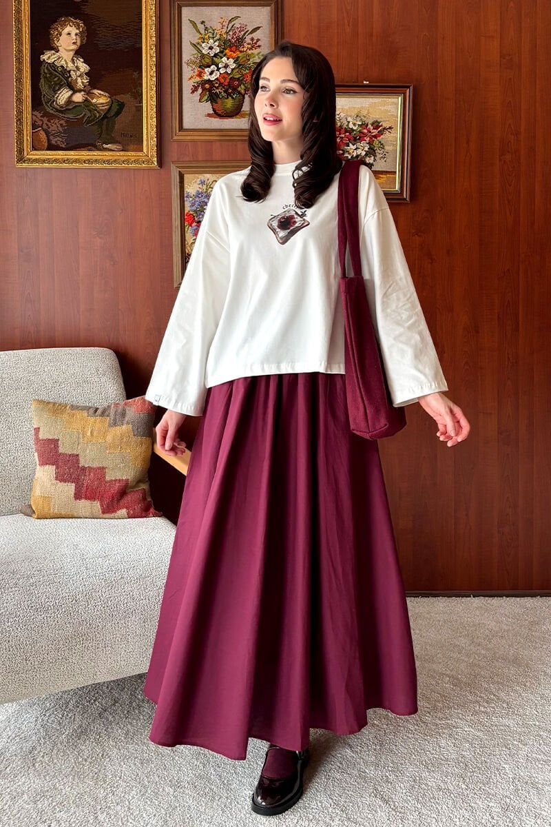 Ekru Reçel Baskılı Body & Bordo Balon Etek Takım