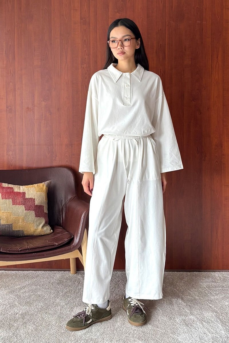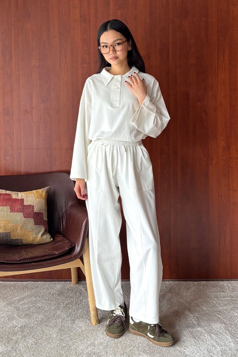 Polo yaka şalvar pantolon takım, rahatlığı ve şıklığı bir arada sunuyor.