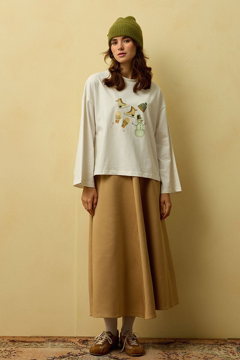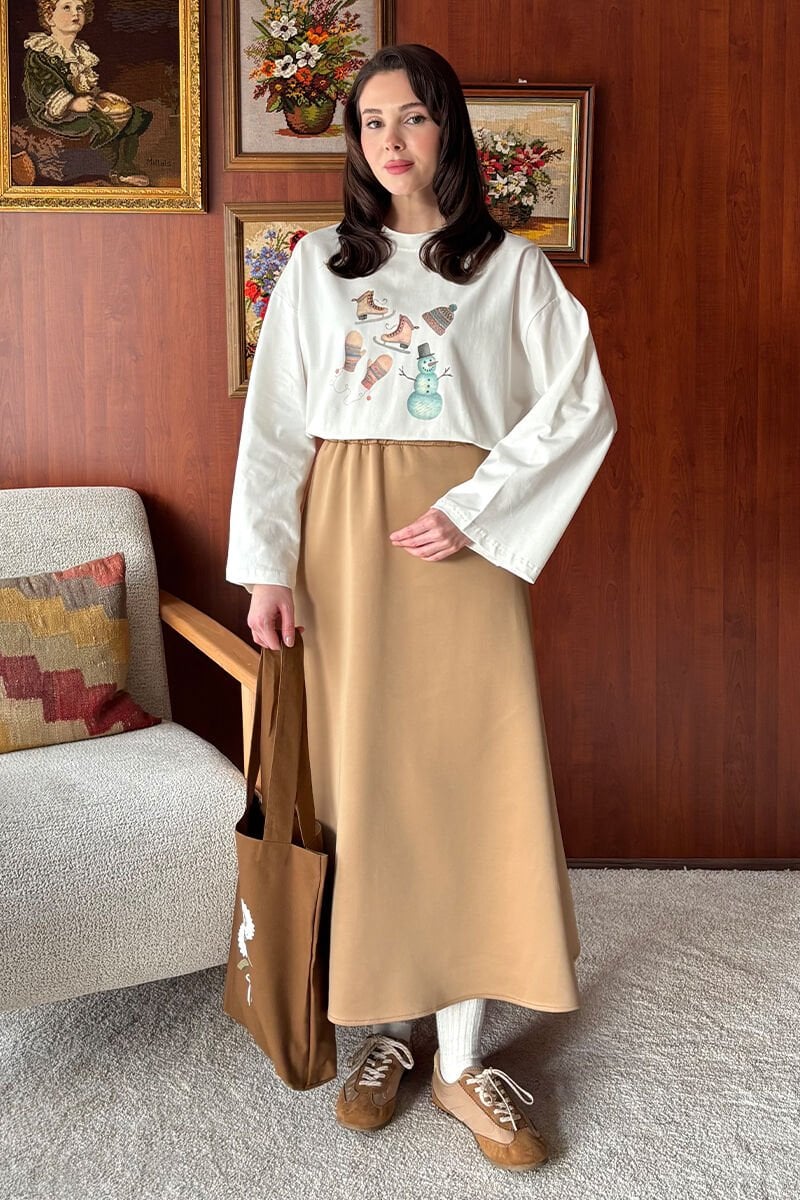 Ekru Winter Baskılı Basic Body & Karamel Scuba Etek
