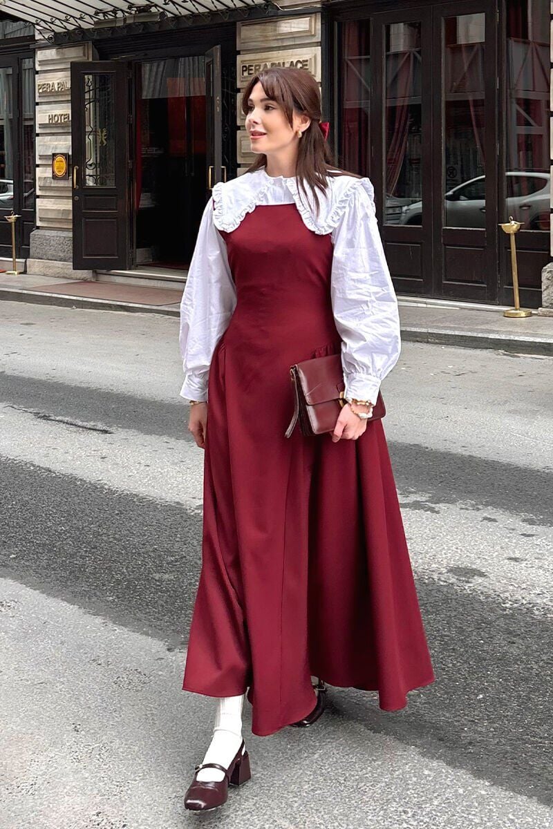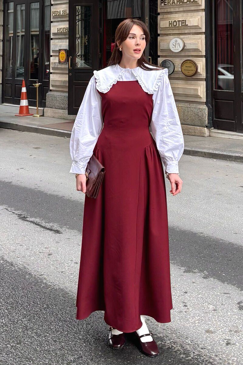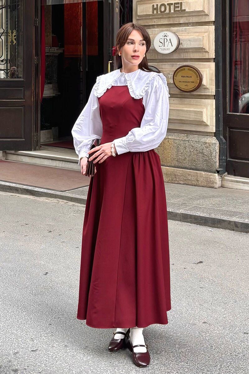 Ekru Yakası Fırfırlı Crop Gömlek & Bordo Krep Korsaj Detay jile Takım