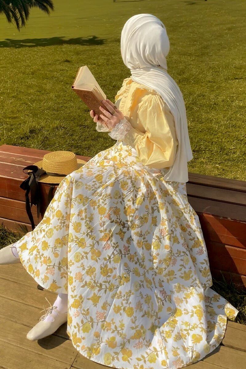 Tereyağ Sarısı Fırfır Yaka Crop Gömlek & Sarı Çiçek Desenli Parçalı Etek