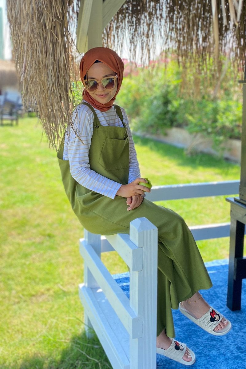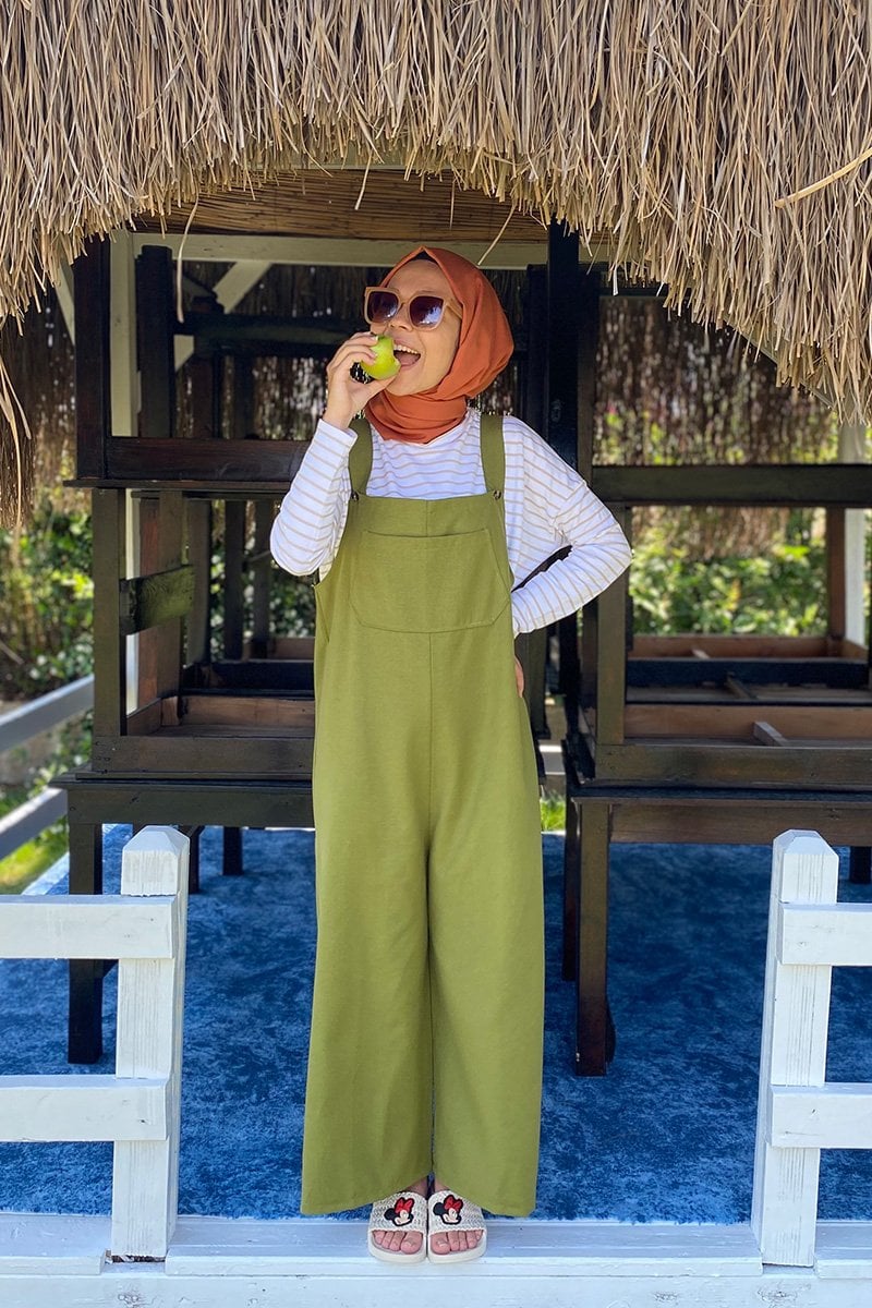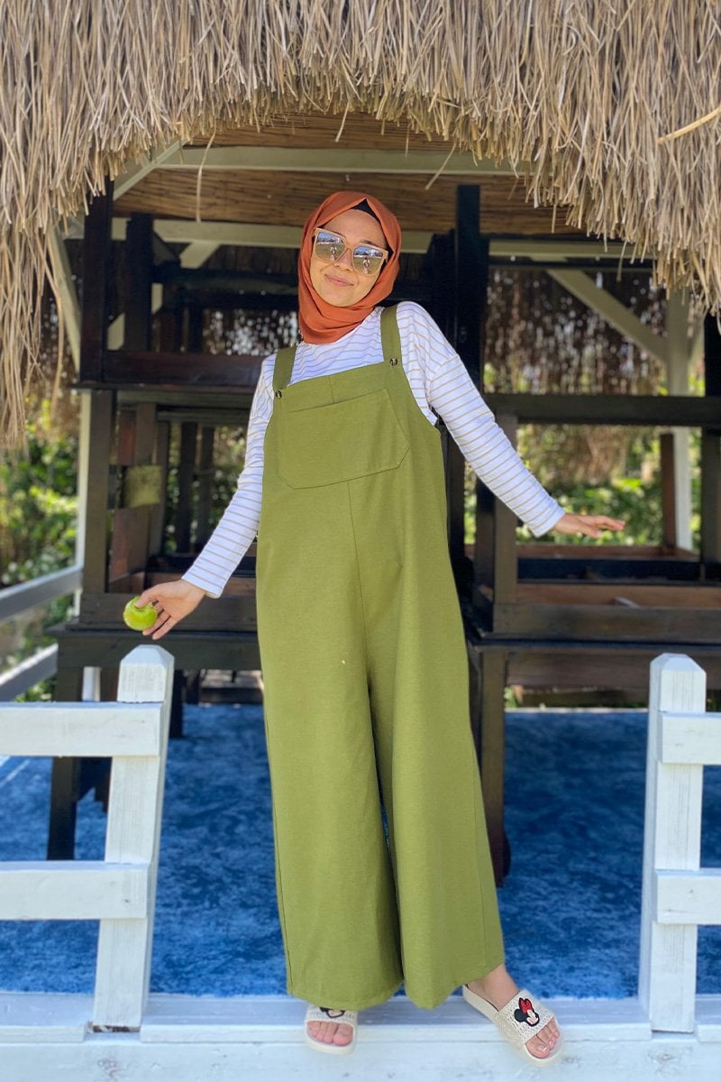Yağ Yeşili Keten Salopet Tulum / Harmandalı