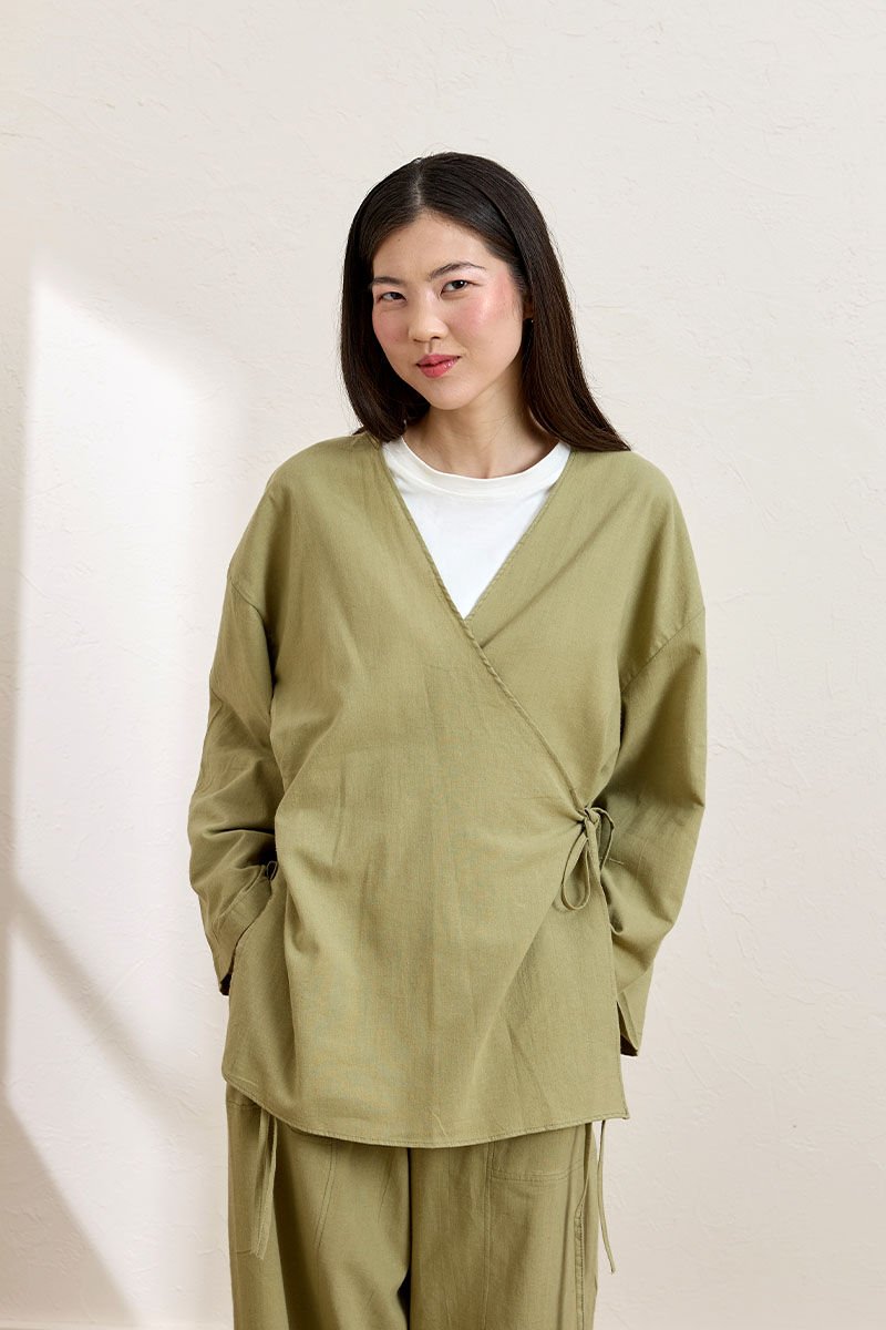 Haki Organik Keten Bağlamalı Tunik