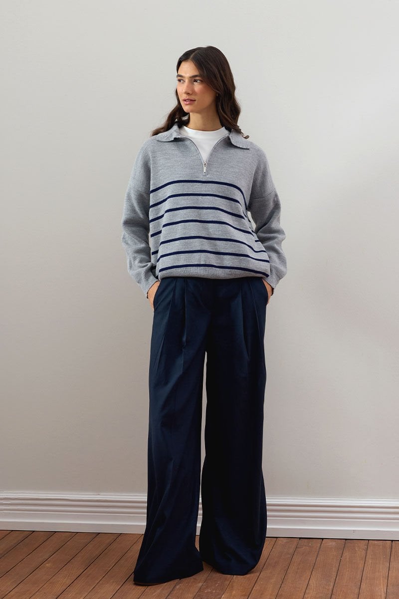 Gri Çizgili Triko Kazak & Lacivert Pile Detay Palazzo Pantolon
