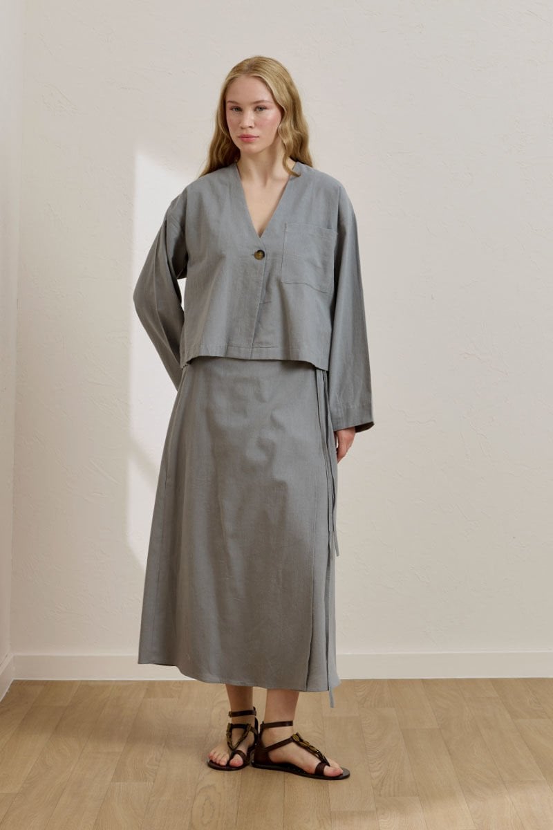 Gri Organik Keten Tek Cepli Ceket & Anvelop Etek Takım
