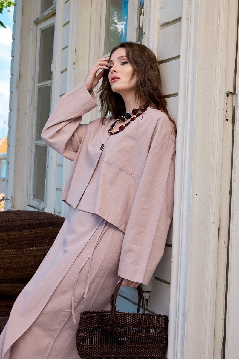 Gül Kurusu Organik Keten Tek Cepli Ceket & Anvelop Etek Takım