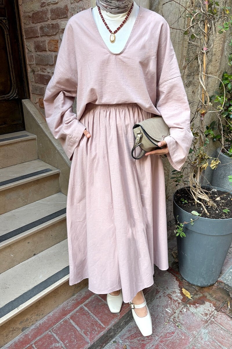 Gül Kurusu Organik Keten Balon Etek & V Yaka Bluz Takım