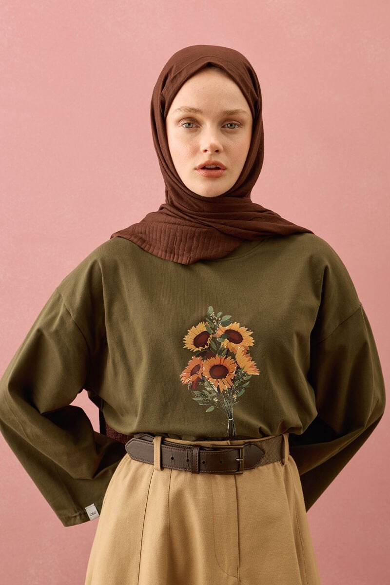 Haki Ay Çiçeği Baskılı Basic Body