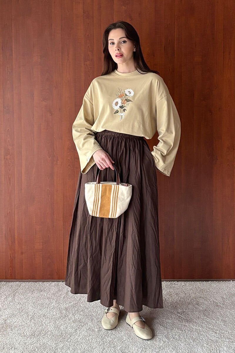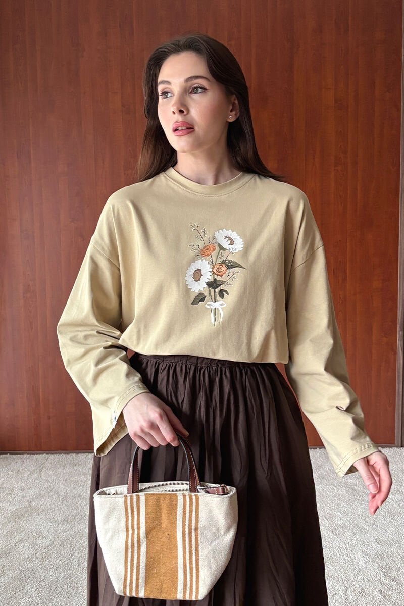 Bej Papatya Baskılı Basic Body & Krem Kraşlı Balon Etek Takım
