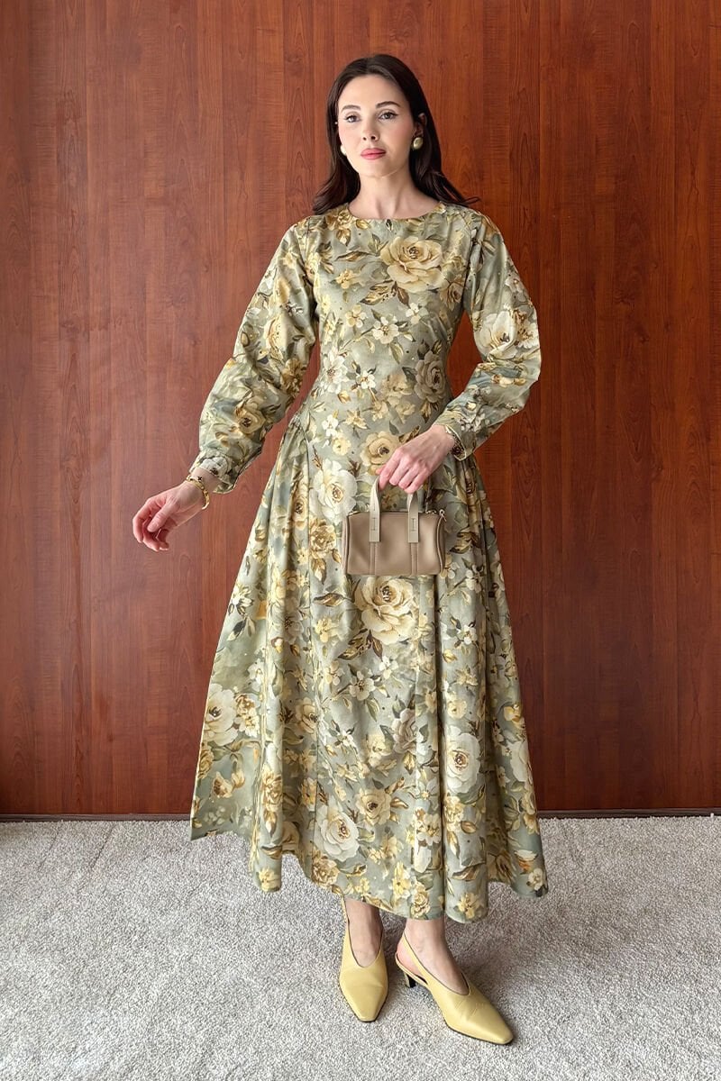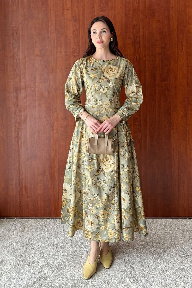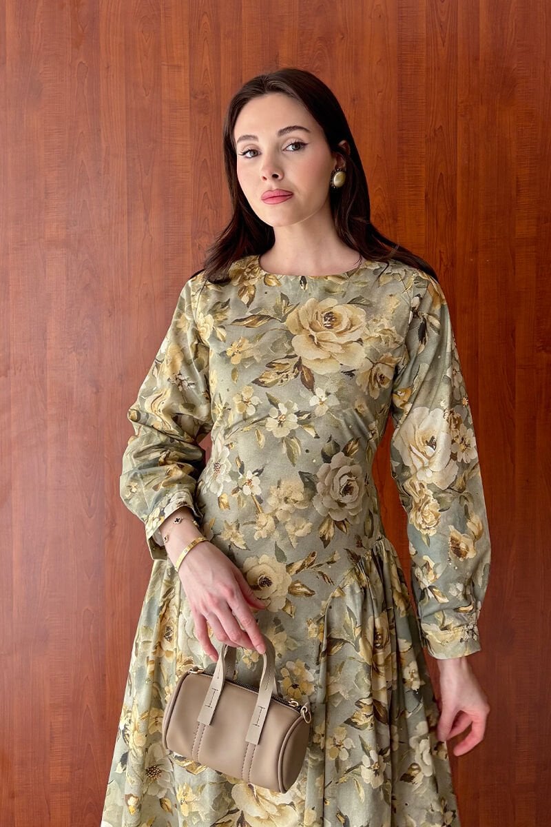 Haki Gül Desenli Korsaj Detay Elbise