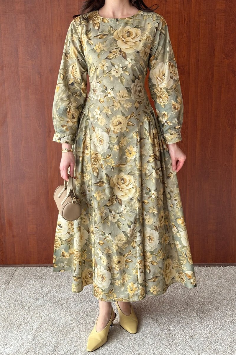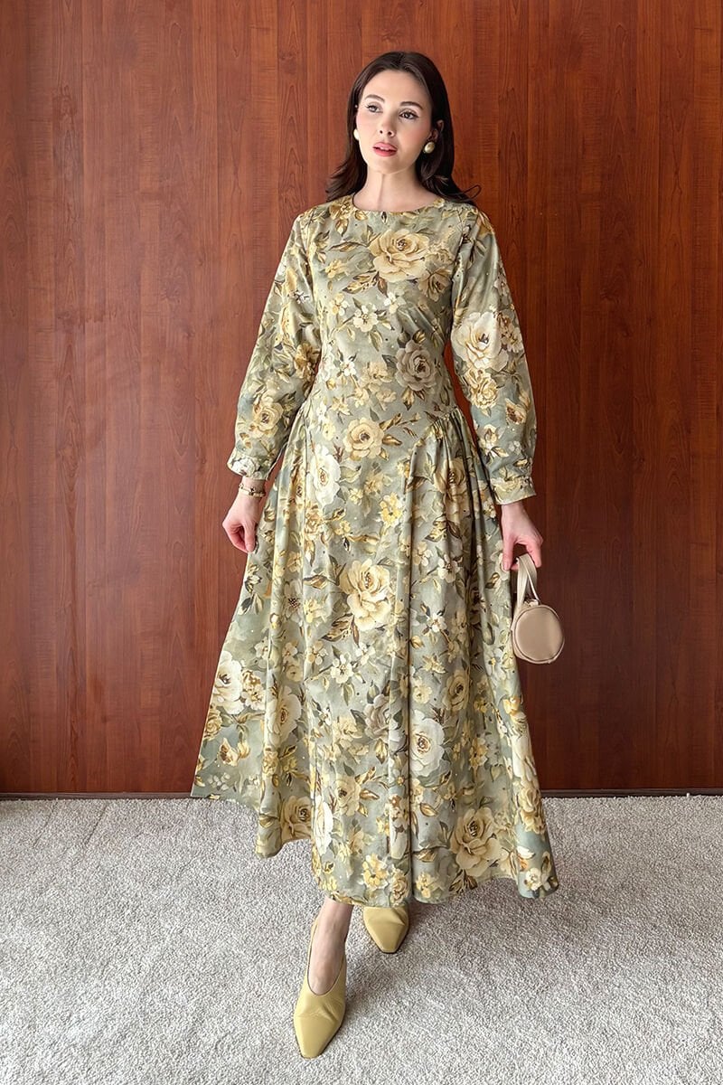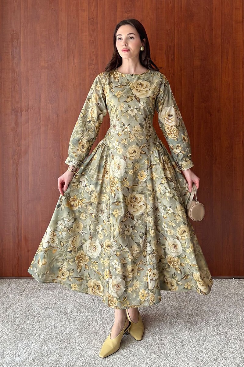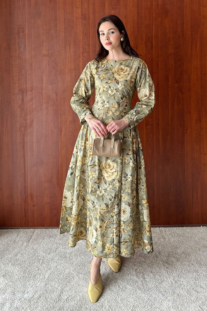 Haki Gül Desenli Korsaj Detay Elbise