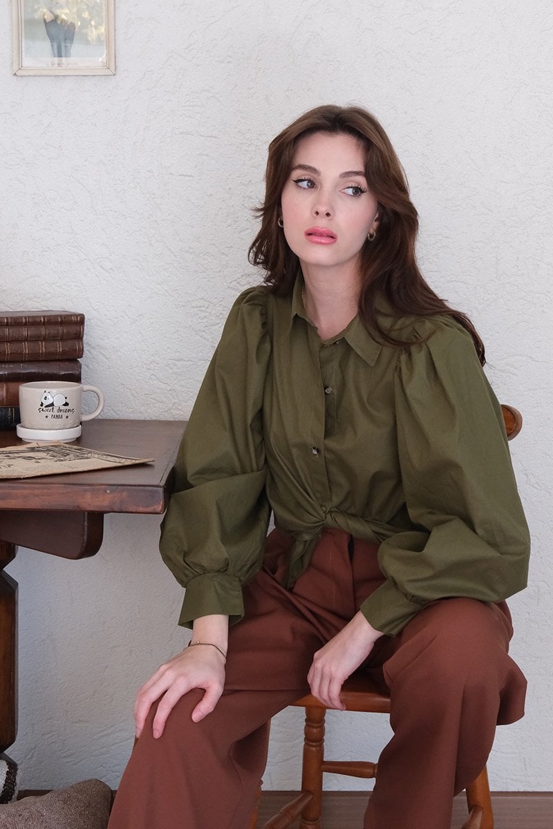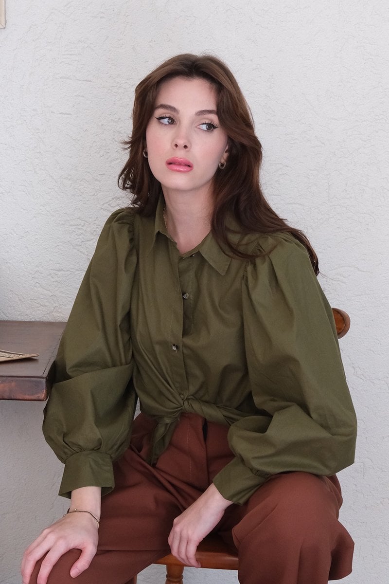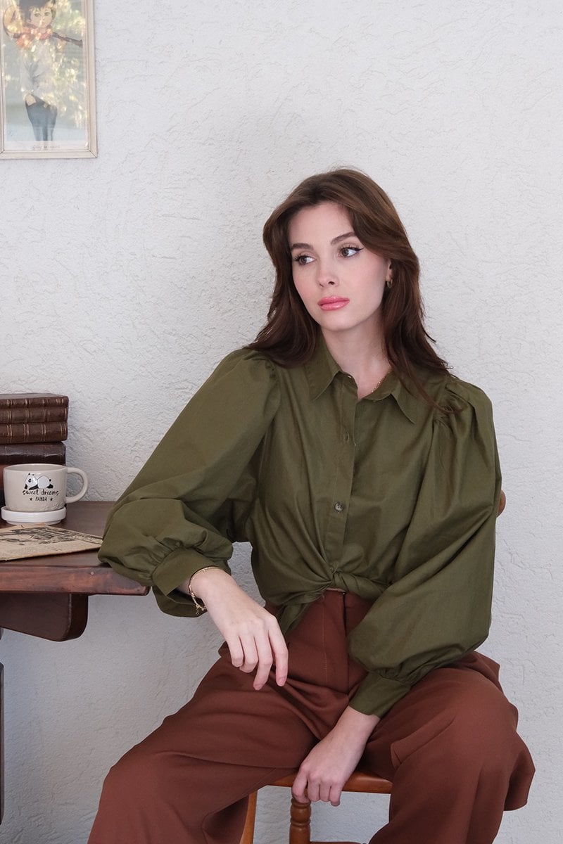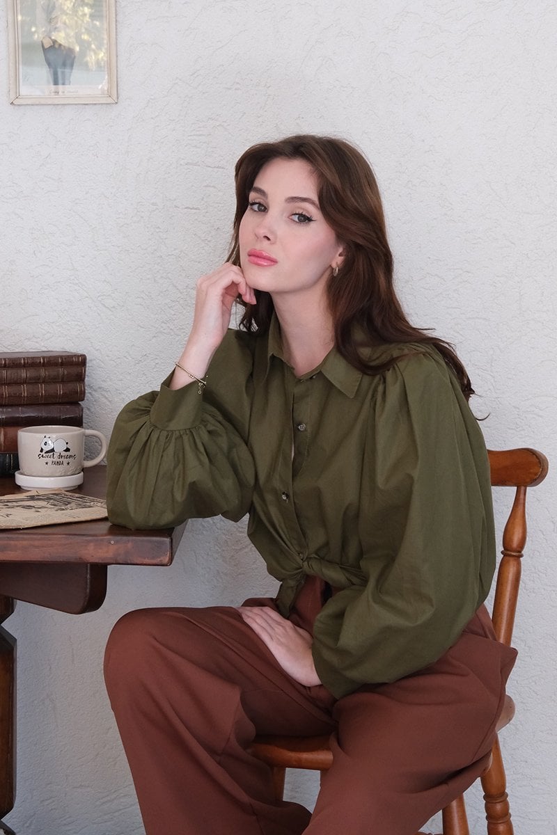 Haki Klasik Yaka Crop Gömlek