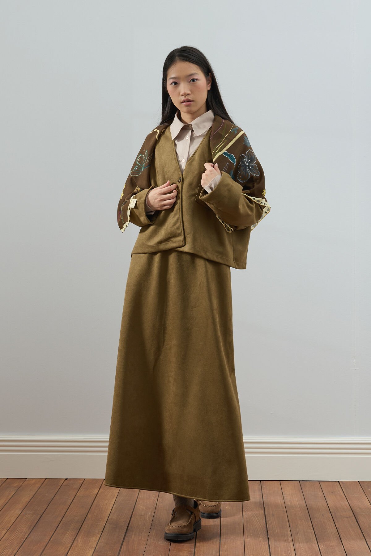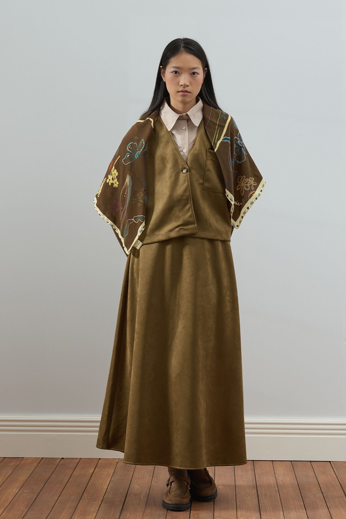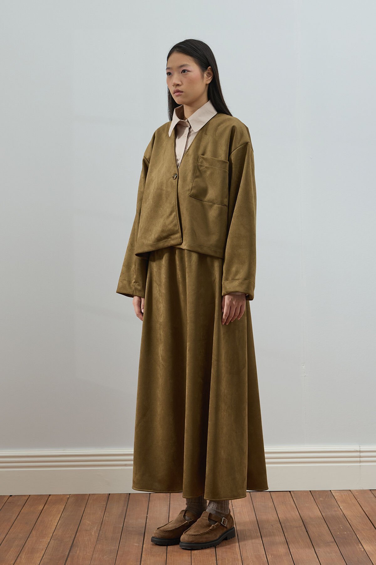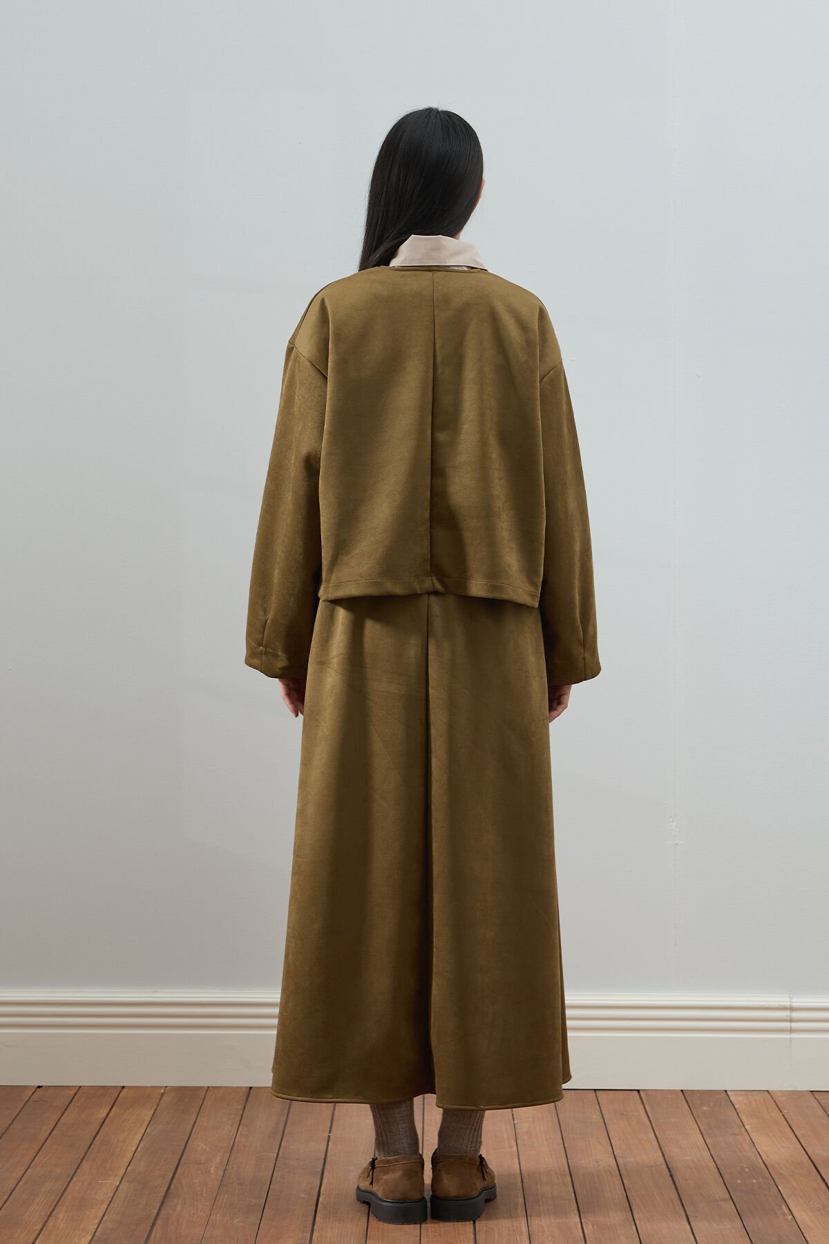 Bu süet kloş etek, zarif ve şık görünümüyle dikkat çekiyor.
