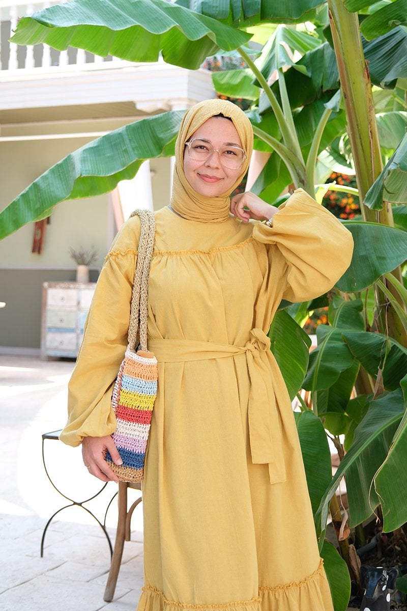 Hardal Organik Keten Eteği Fırfırlı Elbise