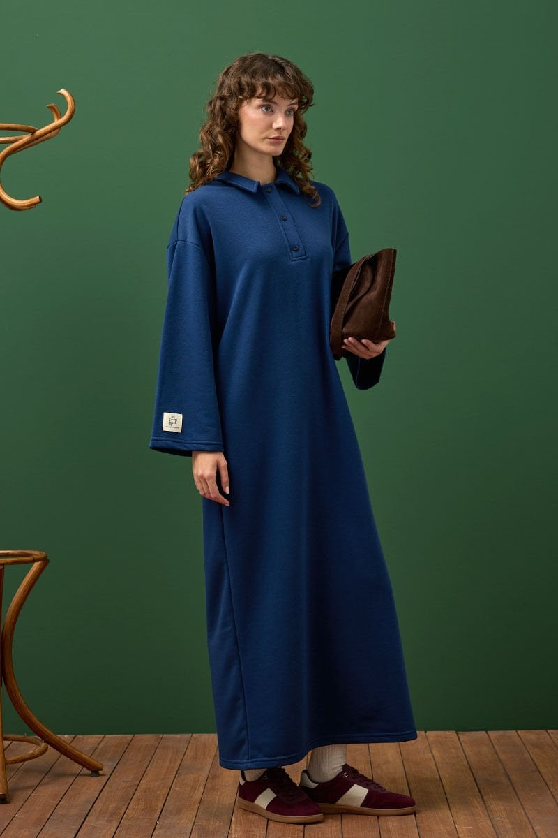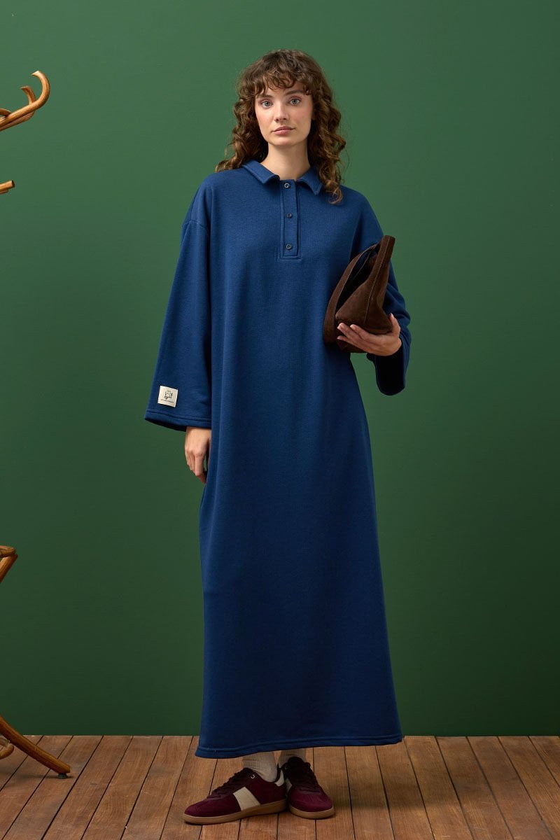 Bu şık ve rahat 3 iplik polo yaka uzun elbise, her an için harika bir seçenek.