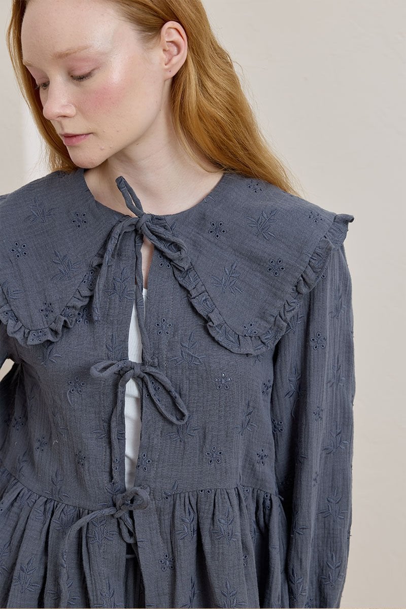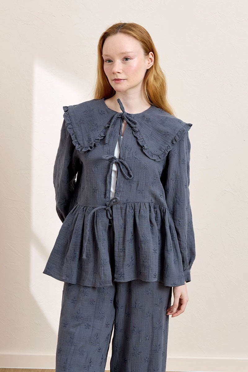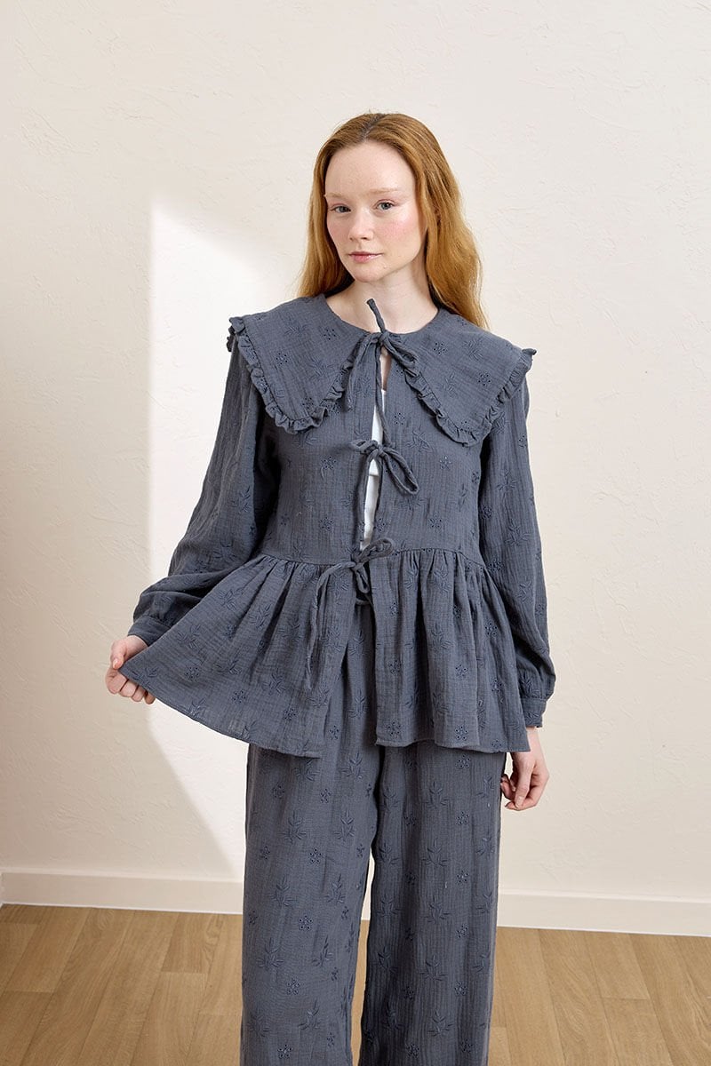 İndigo Fistolu Müslin Robalı Fiyonklu Bluz