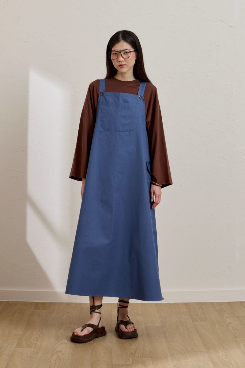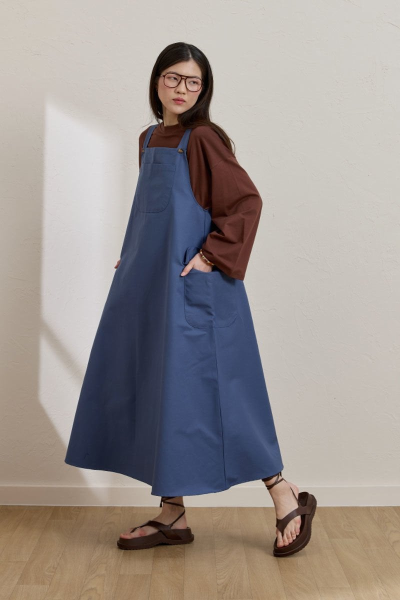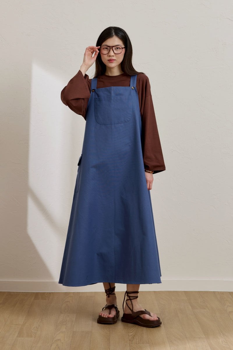 Bu indigo keten etekli salopet, rahat ve şık bir görünüm sunar.